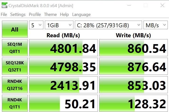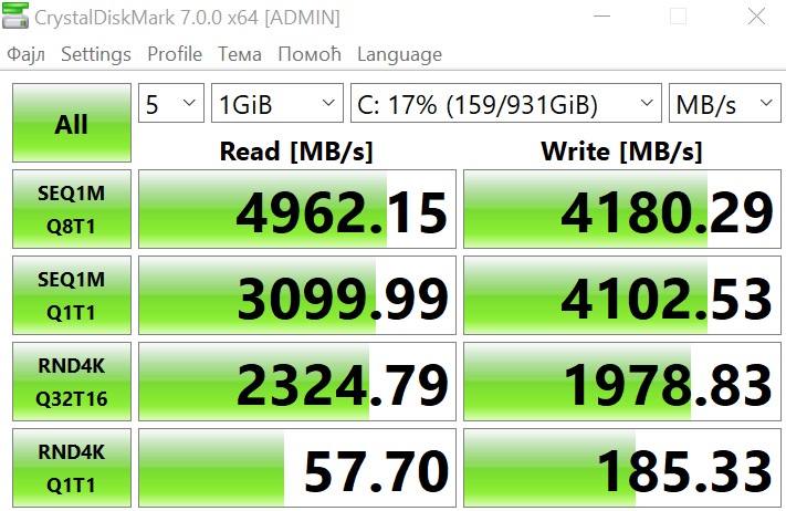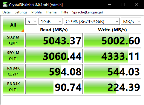 Ich habe es auch mal mit verschiedenen Power Einstellungen probiert und hatte dann mal kurz 2250MB/s schreibend. Vielleicht mal länger die PCIe Stromeinsparungen aussetzen ?