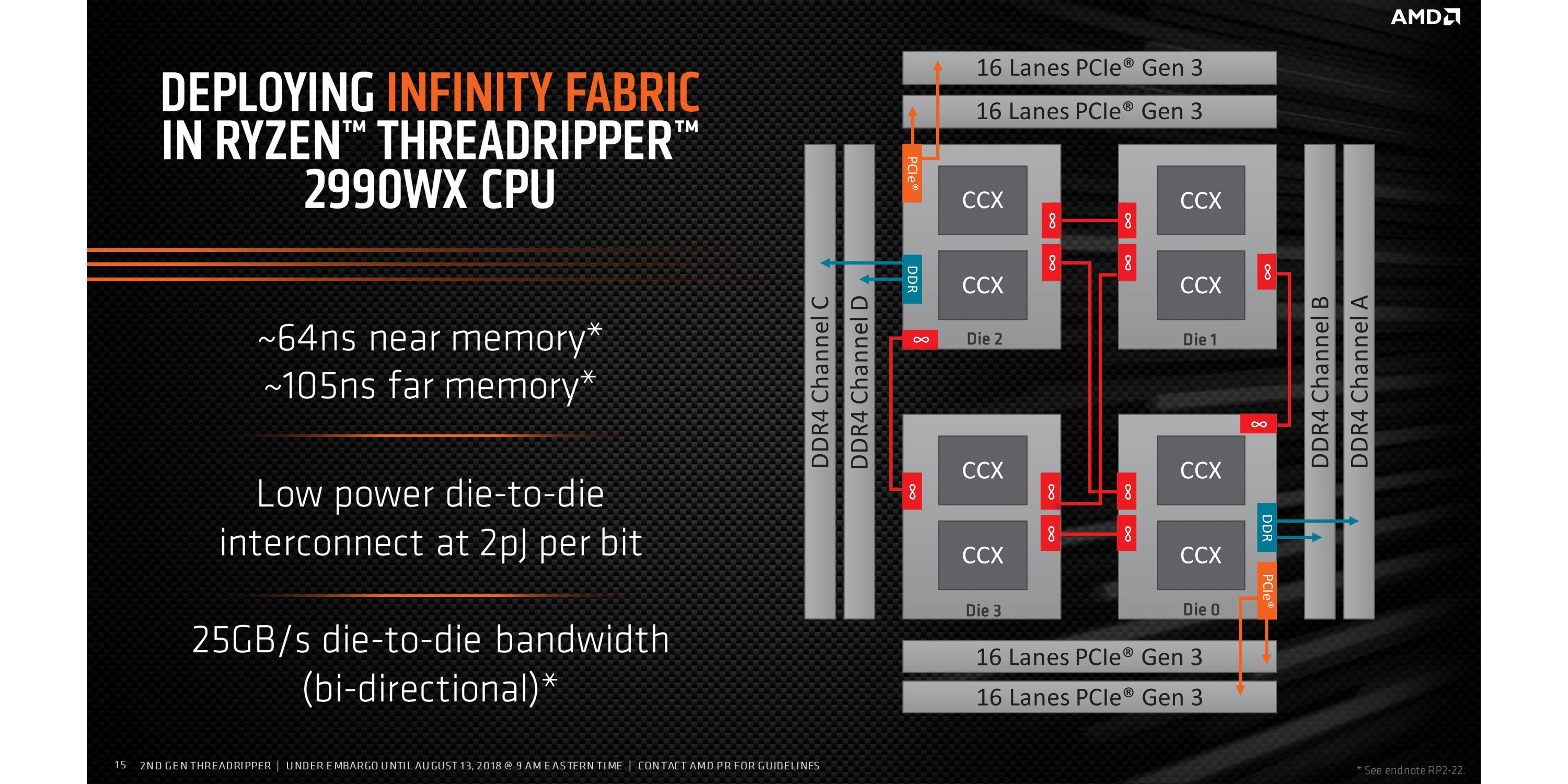 https://www.computerbase.de/2018-08/amd-ryzen-threadripper-2990wx-2950x-test/ schrieb:Von zwei CCX werden die Speichercontroller nicht direkt nach außen geführt, sondern über Infinity Fabric mit den Controllern der anderen beiden CCX verbunden.