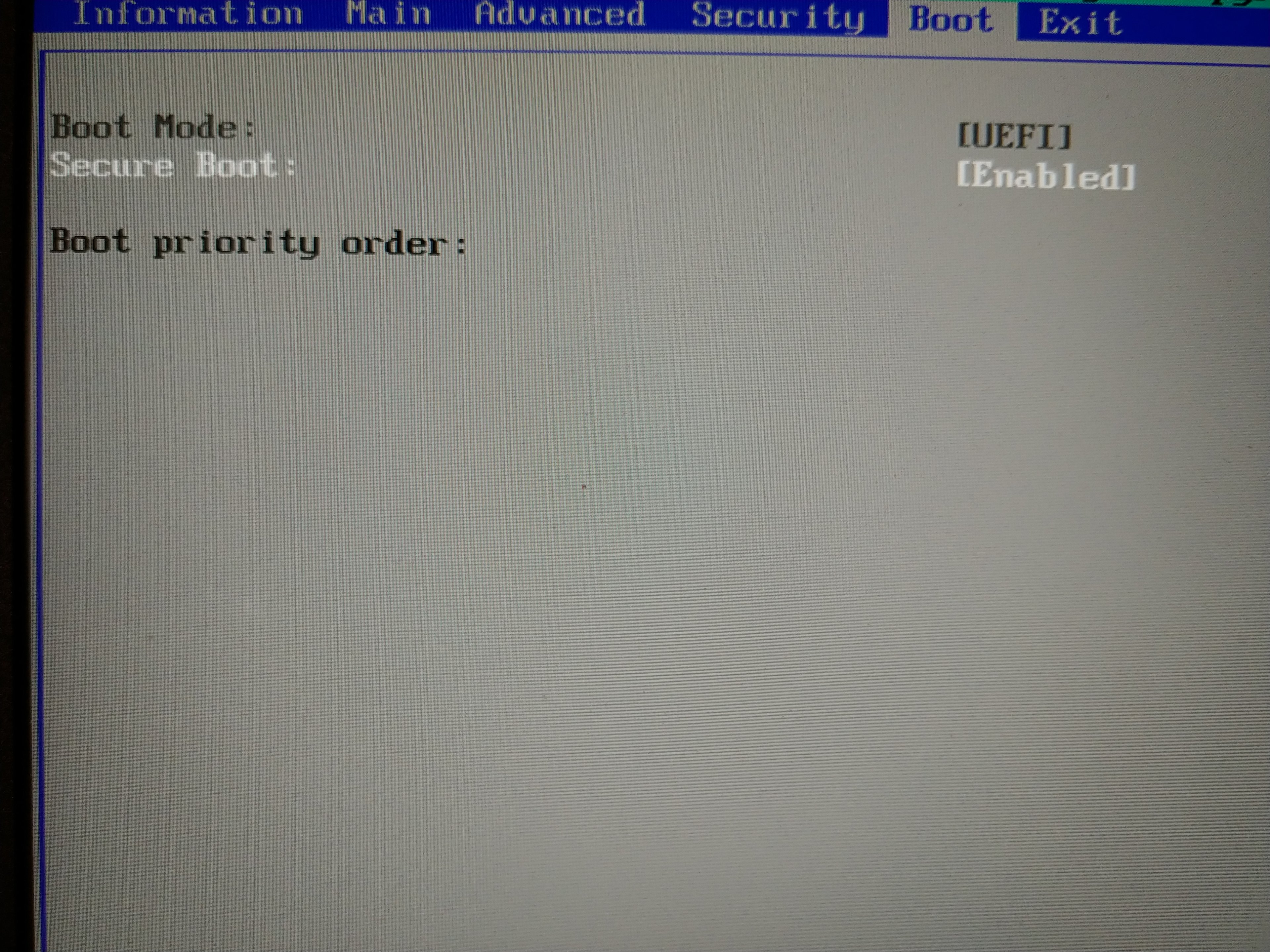 - Auf der Seite "Boot" ist "Boot Mode: [UEFI]" grau, sodass es sich nicht verändern lässt. Unter "Boot priority order:" wird nichts angezeigt. Es sei denn, ich hänge meine Externe Festplatte mit Knoppix oder Windows 10 per USB an. Dann erscheint die dort, bzw. von der wird gebootet (siehe nächste Punkte). Aber von der Internen SSD kann nicht gebootet werden.
