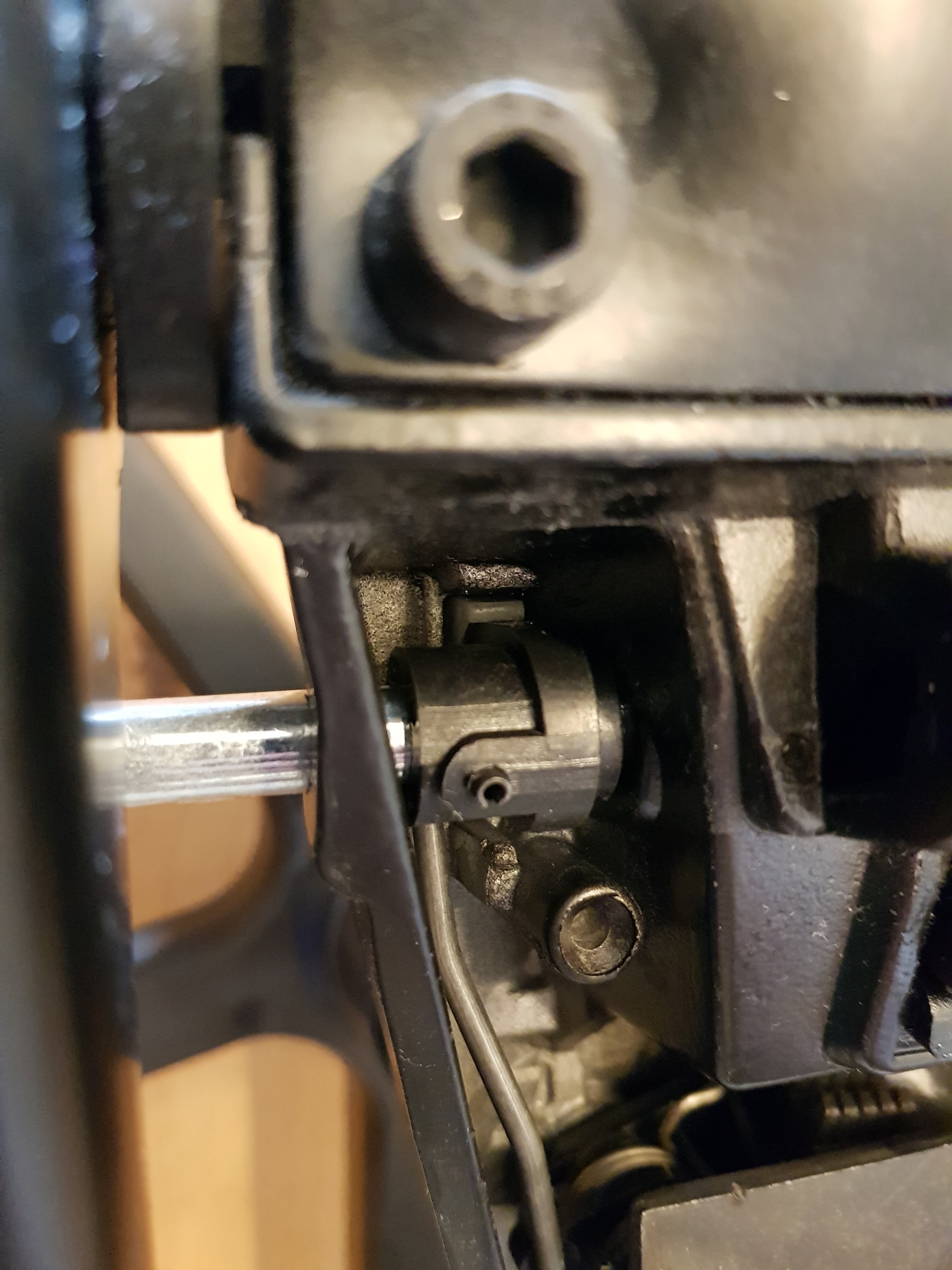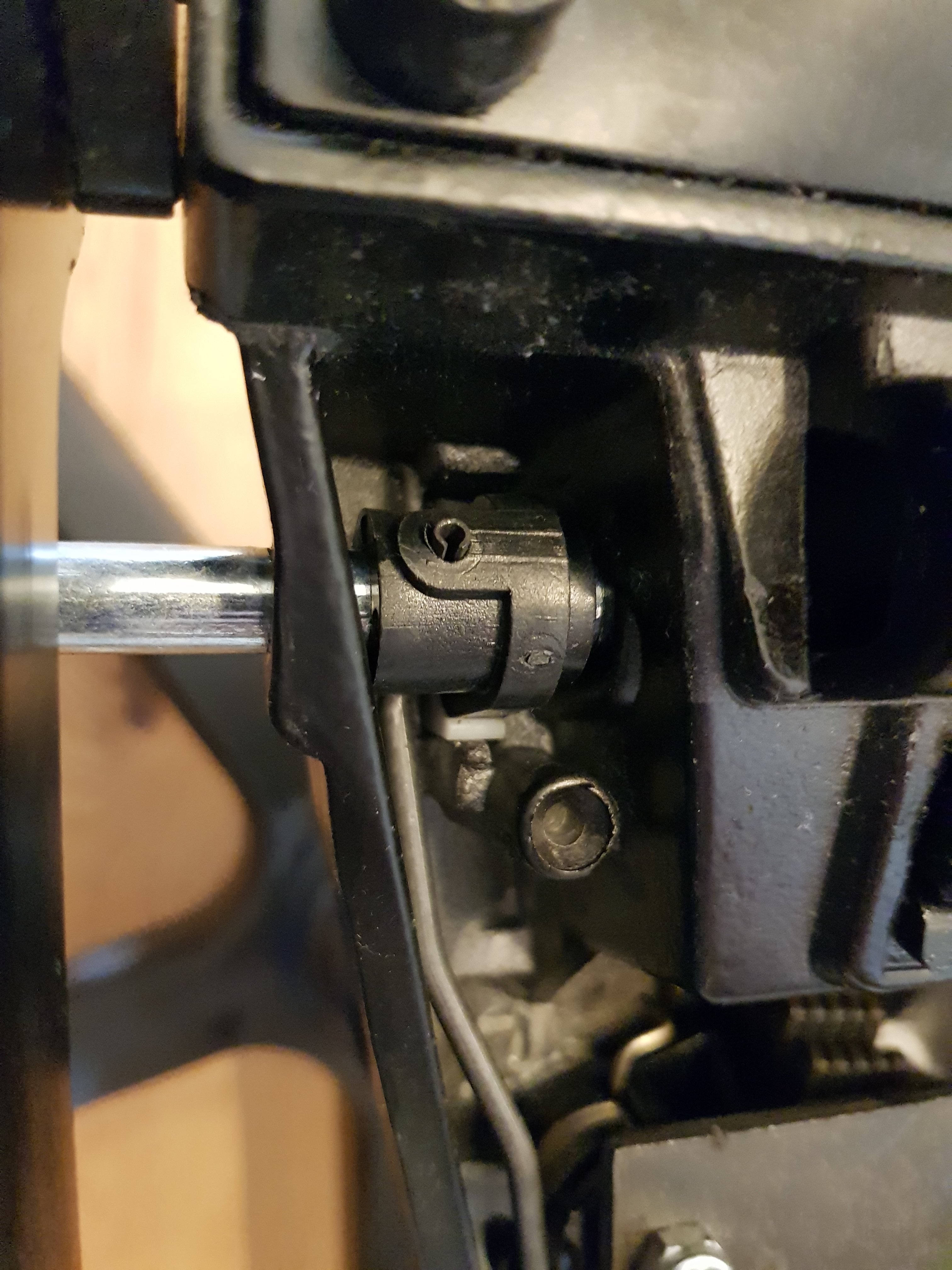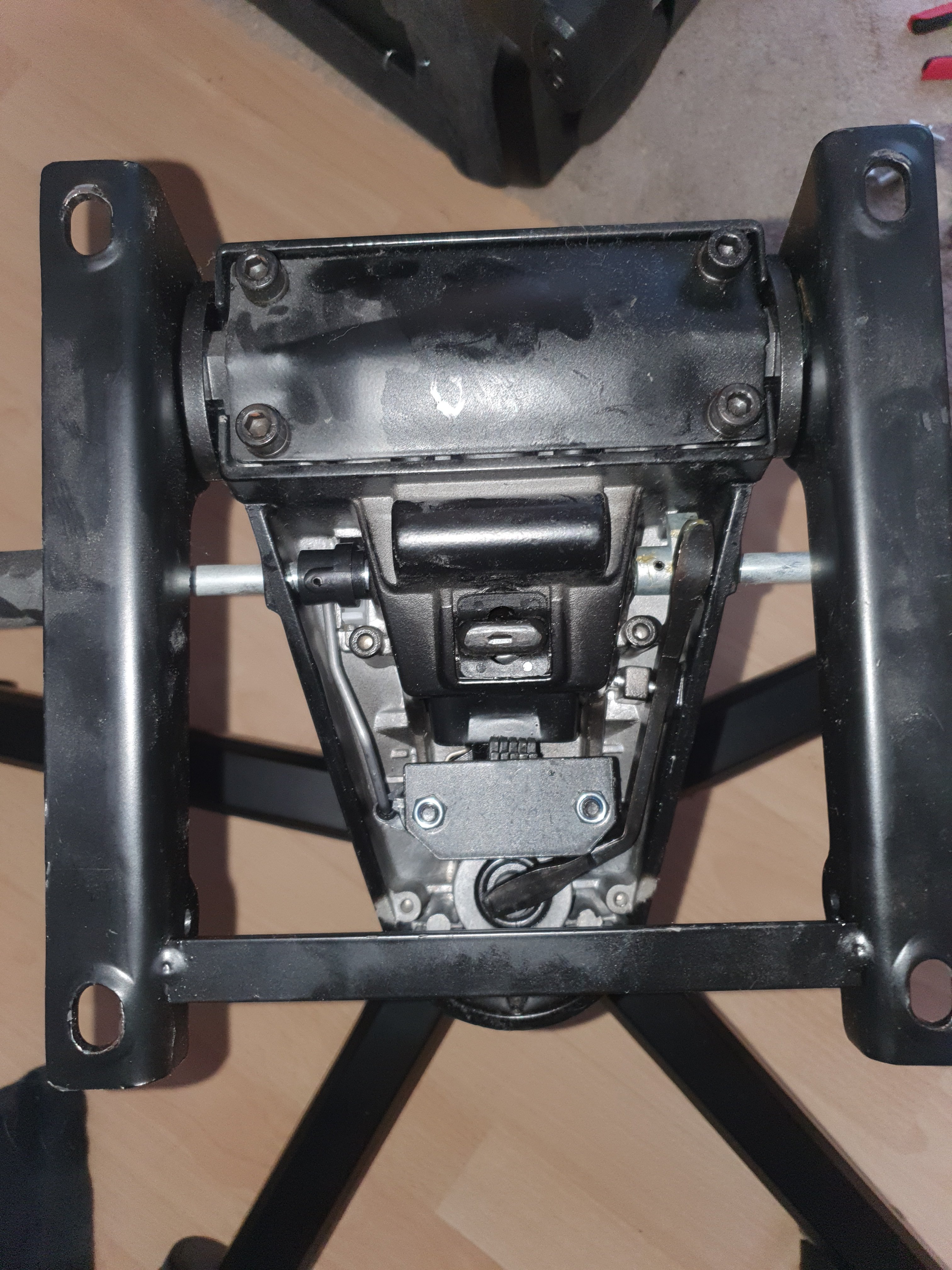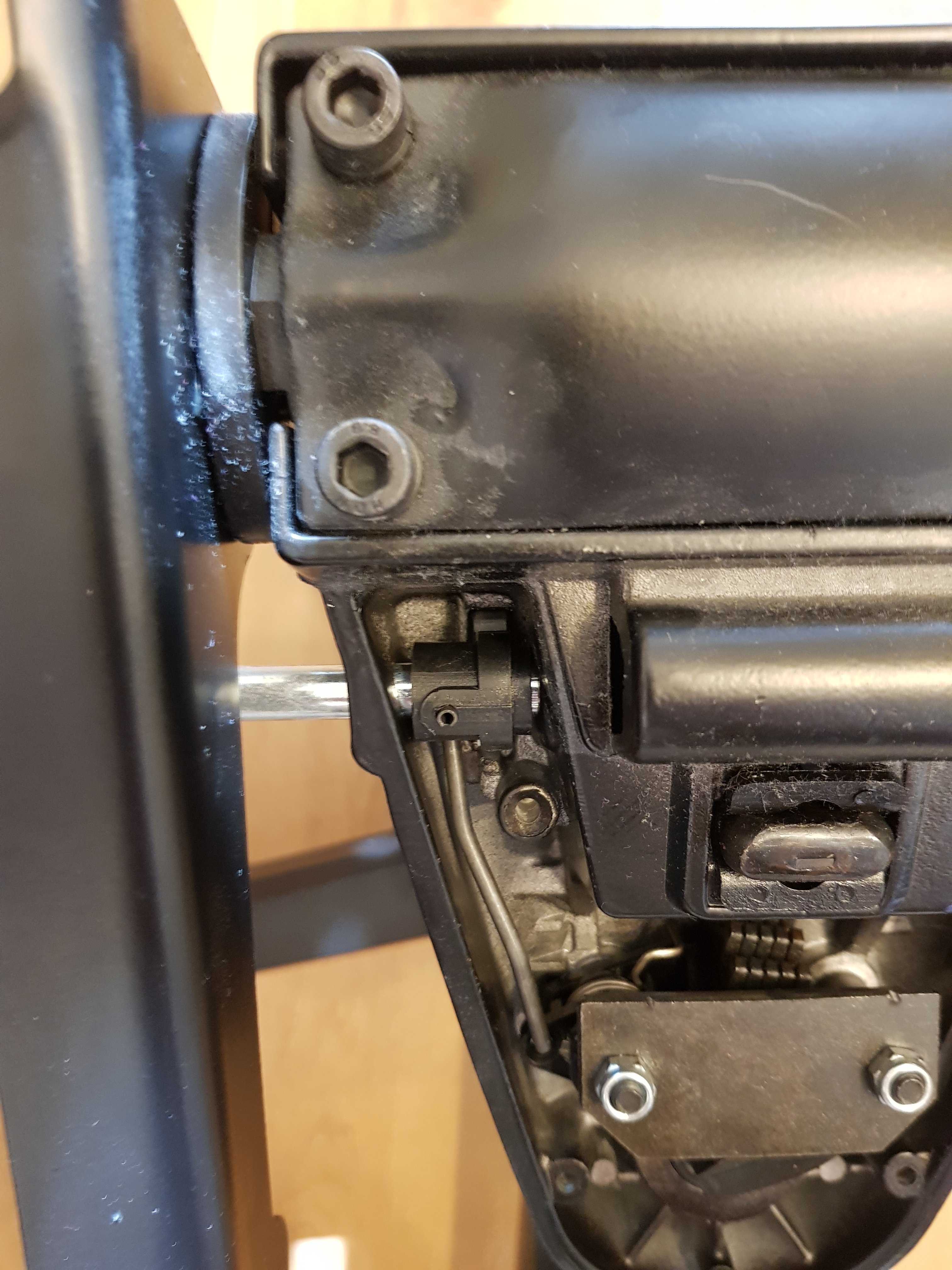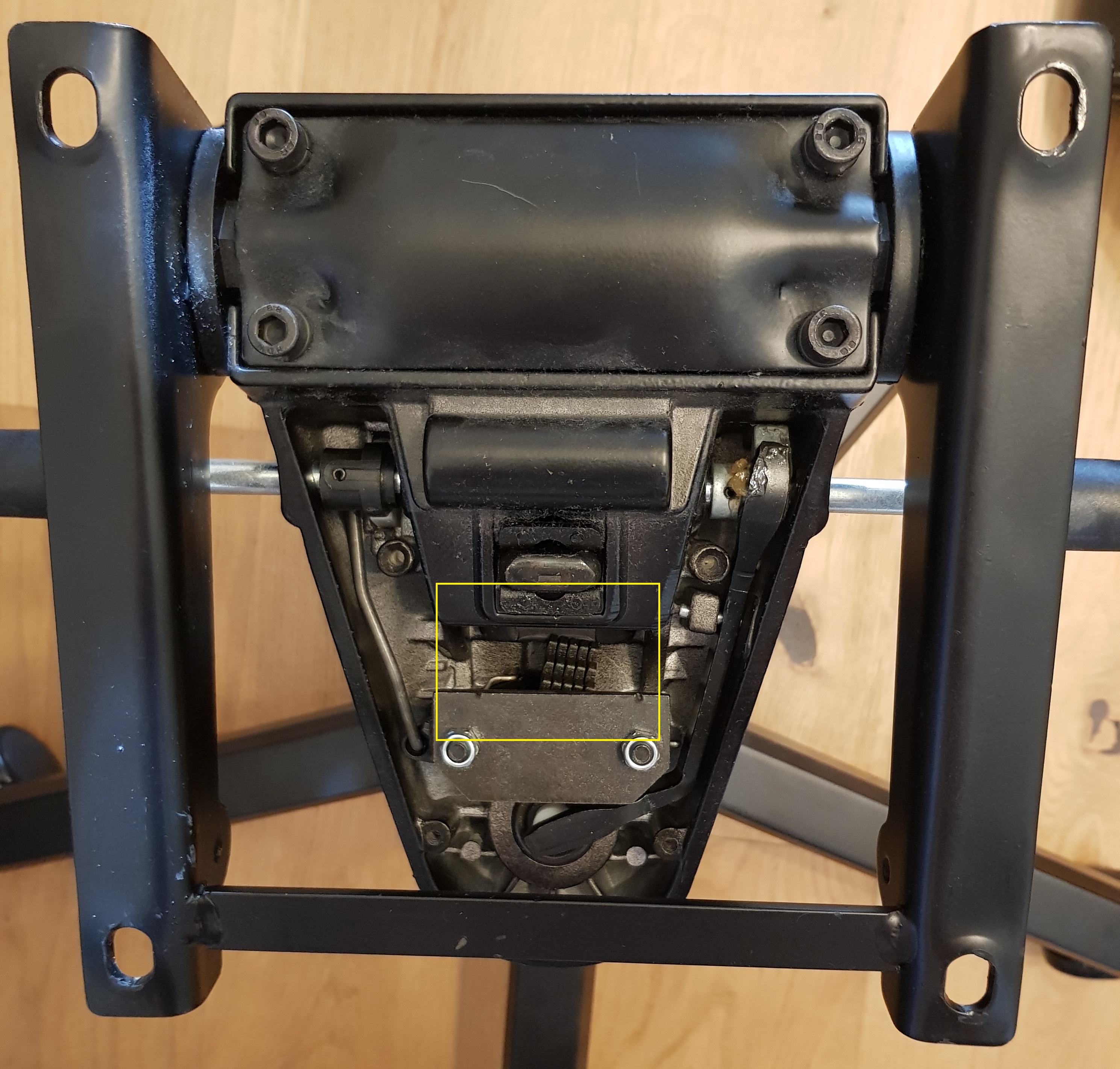 Ich habe das Unterteil von der Sitzfläche abgeschraubt und die Plastikabdeckung abgenommen. Es dürfte auf den ersten Blick nichts gebrochen sein - der Wipphebel schiebt weiterhin die beiden weißen Kunststoffteile zur Seite.