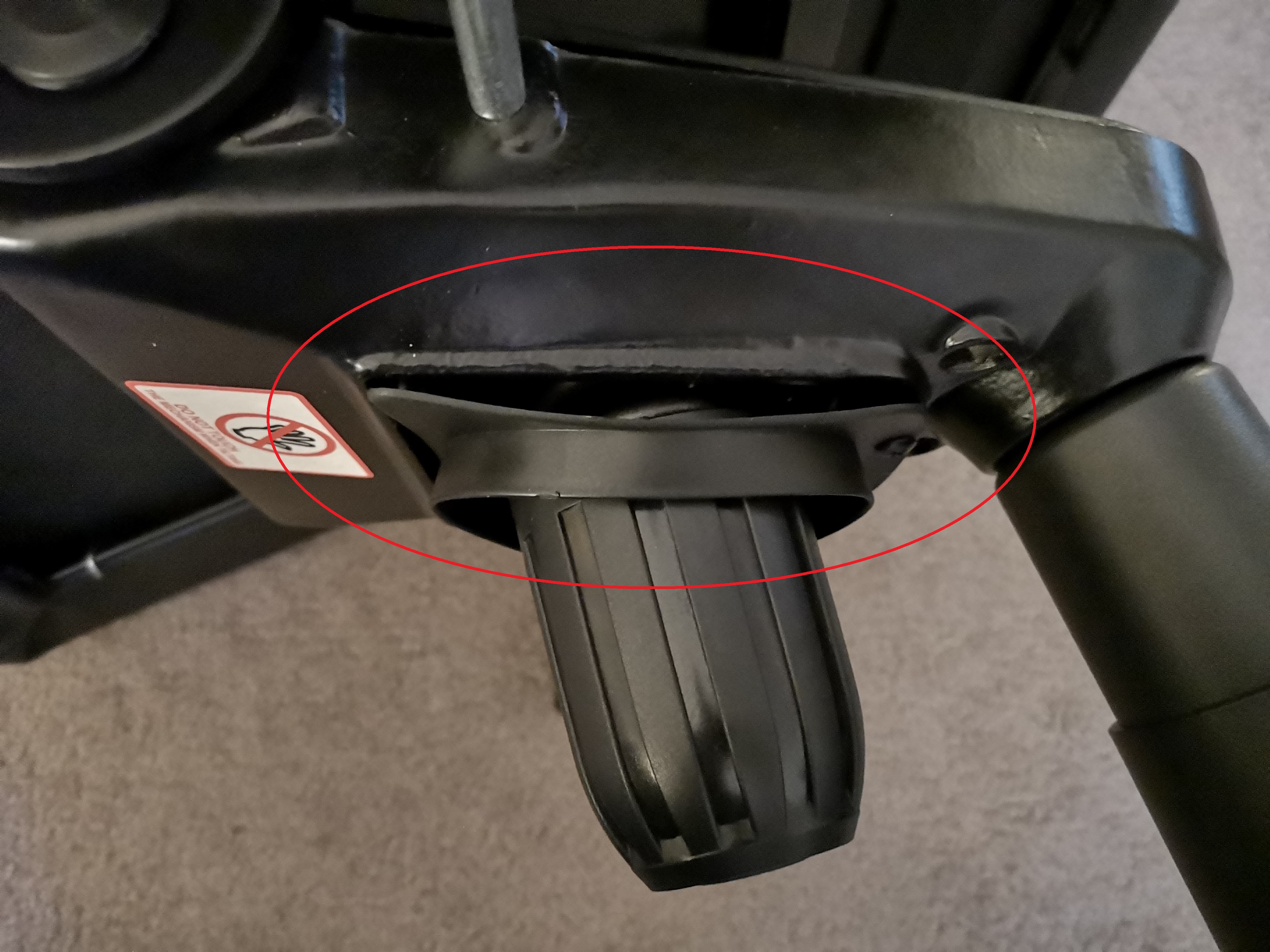 4. Nicht nur die rechte Armlehne, sondern auch der Stuhl als solches steht schief. Dreht man das Fußkreuz in selbiger Position,