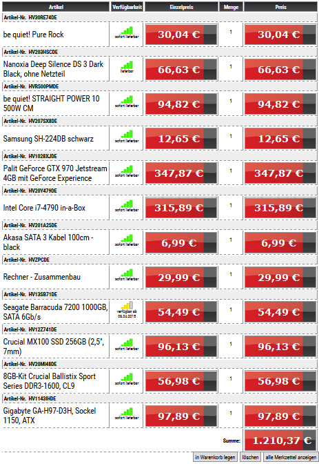 Wie sieht es bei der Konfiguration mit Kühler, Mainboard, Arbeitsspeicher, Netzteil aus?