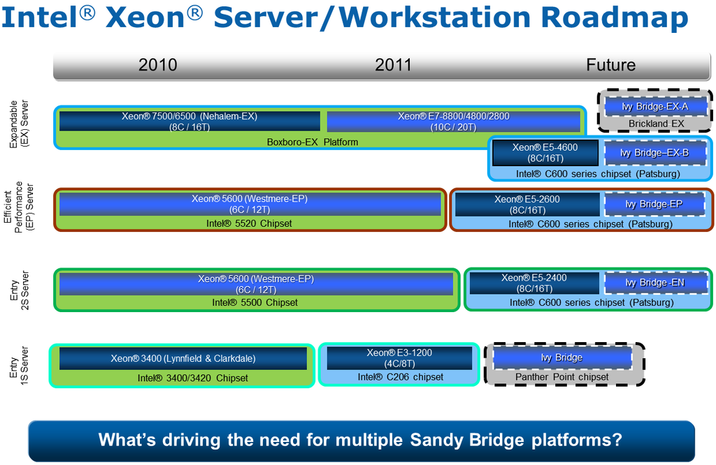 Ja später wird das wohl so, aber nicht 2011 bzw. Anfang 2012. Ivy-Bridge-EX soll Westmere-EX ablösen, der aktuelle auf dem LGA 1567 sitzt. Dort wird wohl auch der LGA 2011 greifen. Gibt einen halben Plan, sh. Anhang. Es scheint aber auch dort noch eine Zweiteilung zu geben. Aber das wird alles nicht vor Ende 2012 oder Anfang 2013, also noch vieeeel Zeit.