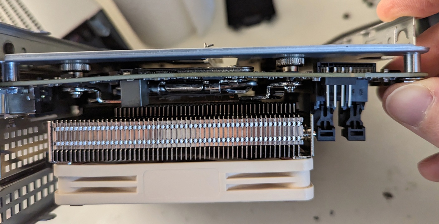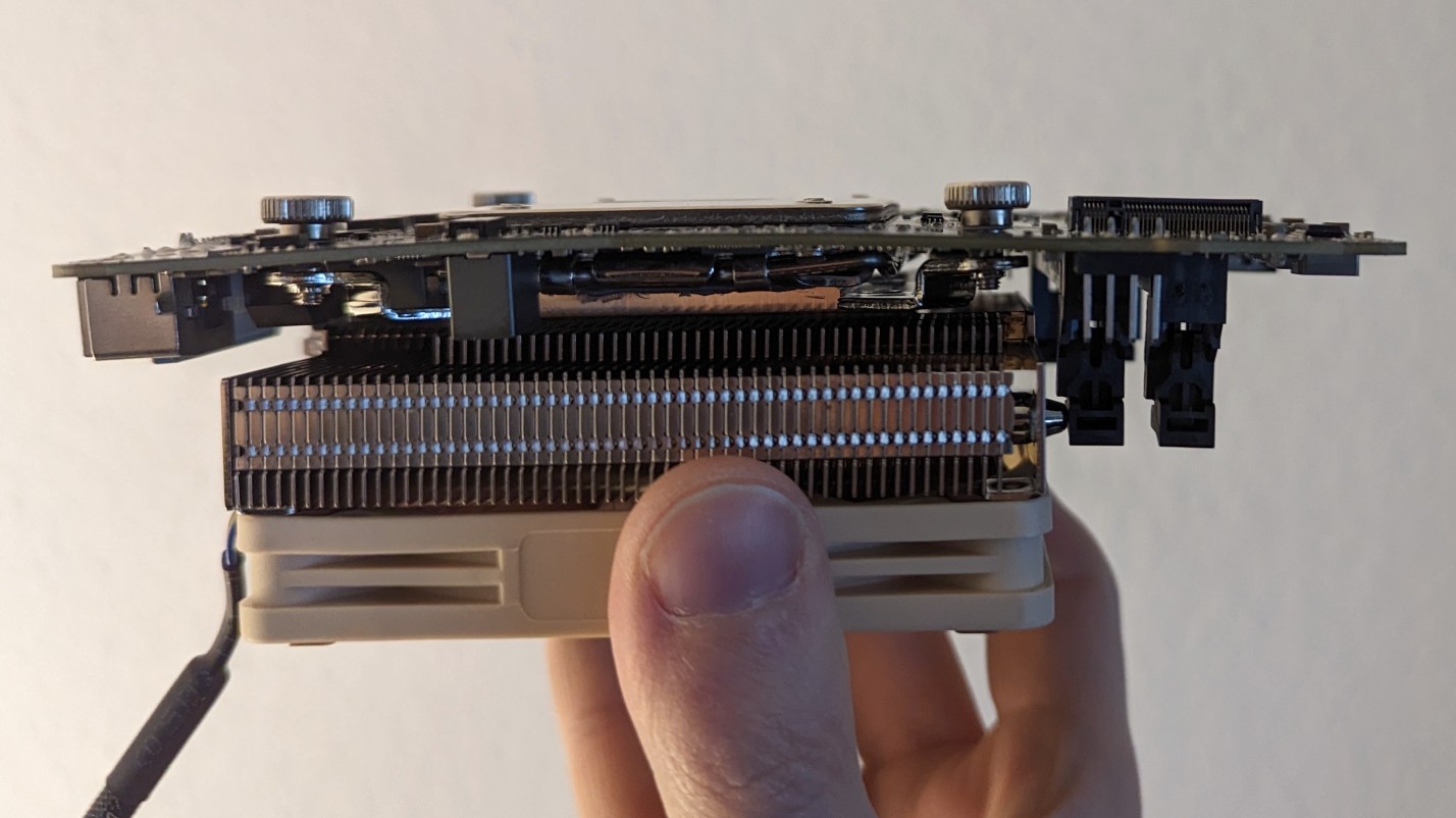 Bei der Sockel 1700 Variante des L9i gibt es keine Backplate mehr. Die Hebelwirkung der Kühler-Beine sowie das gesamte Gewicht, des Kühlers liegt auf einem winzigen Teil der Platine, dadurch entsteht auf der kleinen Deskmini Platine eine sichtbare Krümmung (Siehe Anhang).