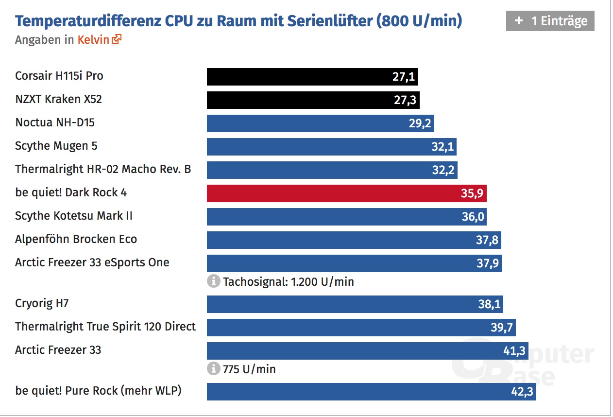 Btw. ich bin schnell auf den Link gegangen und der zeigte sofort auf der ersten Seite einen Temperaturunterschied bei 800rpm zwischen dem Noctua und dem Darkrock von 6.7 Grad was nicht grad wenig ist. 2 Aios waren noch 2 Grad vor dem Noctua, das wars aber schon.