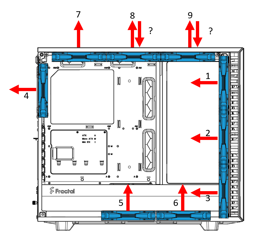 Generell versuche ich staubgefiltert mehr reinzudrücken, als abzusaugen, damit ein Überdruck entsteht und weniger Staub eindringen kann. Kann man beim Define 7 sich den Deckel oben nicht aussuchen, ob geschlossen oder offen? Ich lasse meistens nur 2 und 3 an der Front unten reindrücken. Raus geht es von alleine. Je nach Netzteilanordnung und Grafikkarte entlüften die vielleicht noch etwas. Ich würde auch danach gehen, was und wo verbaut ist. HDDs vorne? Dann die von vorne anpusten lassen, usw.