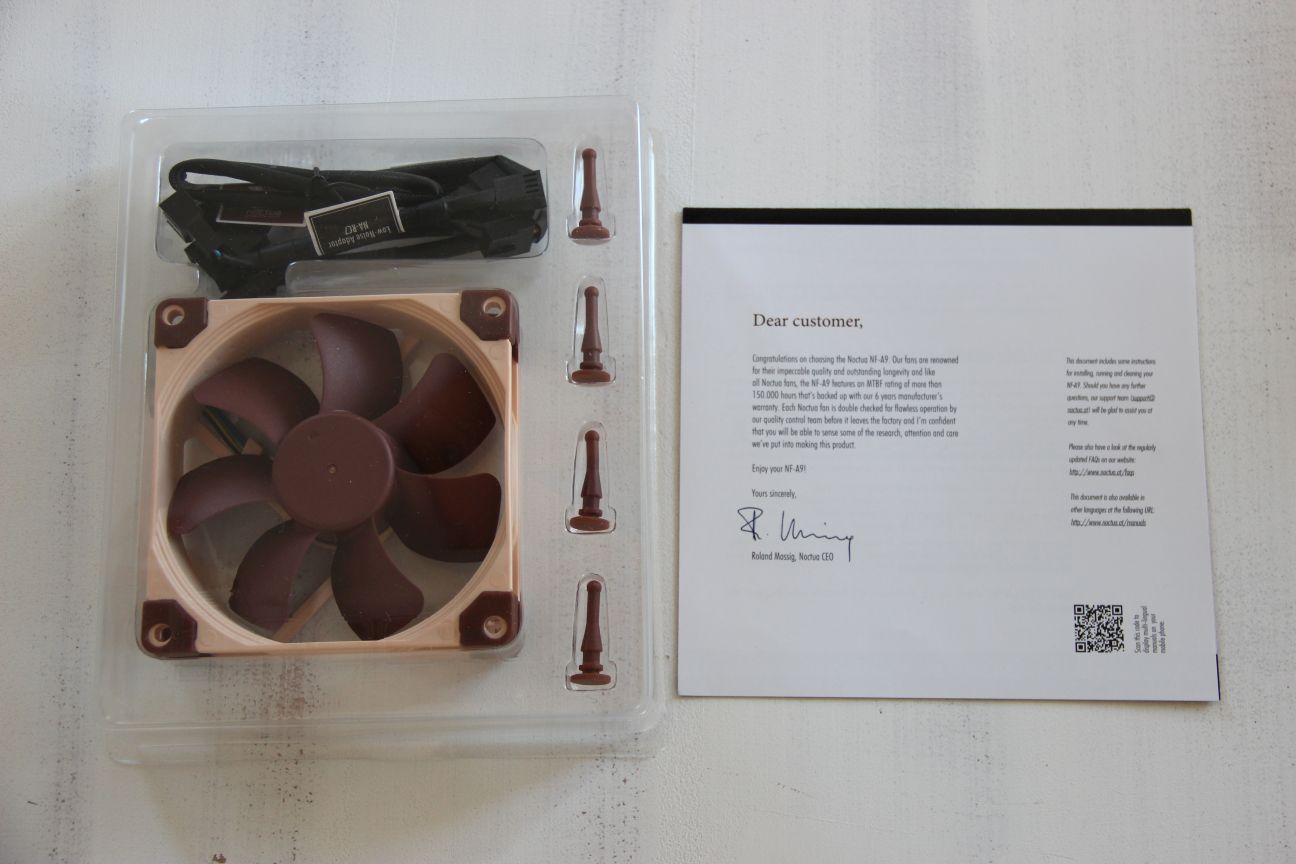 Netterweise stellte mir Noctua einen 92x92x25 Lüfter zur Verfügung um auch die Lautstärke und Kühlleistung mit einem anderen Lüfter ermitteln zu können. Im Handel kostet dieser 19€ ohne Versand, welches ein stolzer Preis ist. An der Verpackung des NF-A9 PWM wurde allerdings auch nicht gespart und mal erhält eine üppige Ausstattung für einen Lüfter.
