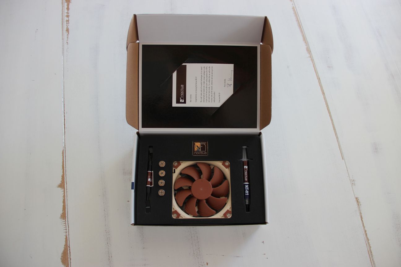 Im Lieferumfang enthalten sind dabei 4 Befestigungsschrauben (welche kleine Kunststoff Unterlegscheiben beinhalten), einem Low-Noise Adapter, ein Noctua Case-Badge aus Metall (natürlich kein simpler Folienaufkleber), dem Kühler mit einem NF-A9x14 PWM Lüfter, sowie der Noctua NT-H1 Wärmeleitpaste. Ein Low-Noise Adapter, um die Drehzahl des Lüfters zu begrenzen, ist eine sinnvolle Beigabe.