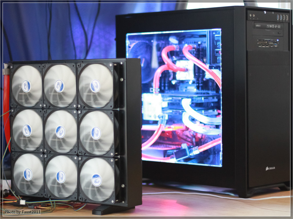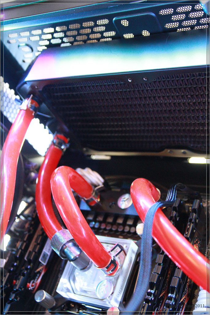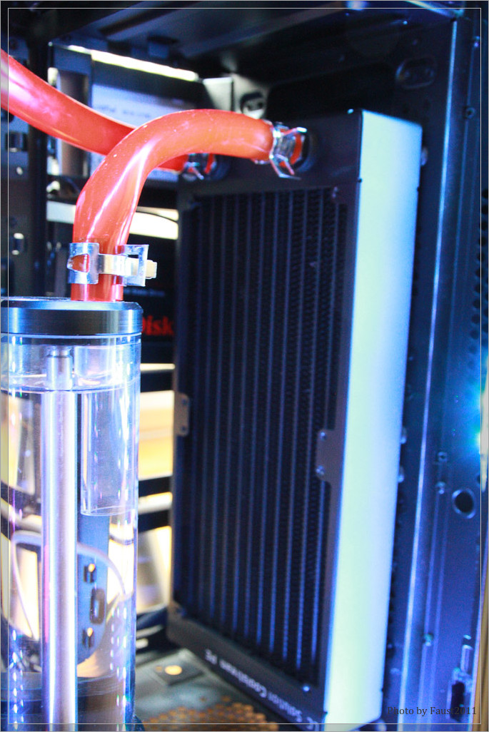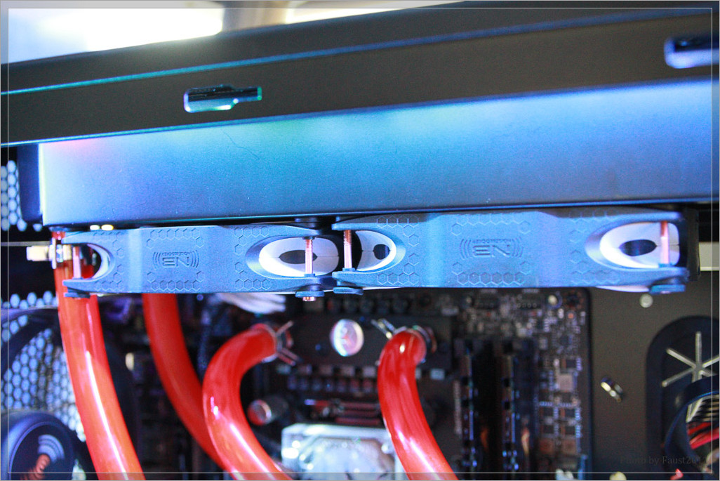 Bevor ich auf weitere Details des Lüfters eingehe, möchte ich kurz den Verwendungszweck erläutern. Der Lüfter ist zur Erweiterung meiner bestehenden Wasserkühlung gedacht. Bisher habe mein System ausschließlich mit einem externen Radiator gekühlt. Dieser hat auch genügend Power, die Abwärme meines Systems abzuführen – nichtsdestotrotz kann man eigentlich nie genügend Radiatorfläche haben, weshalb ich mein System um zwei interne Radiatoren erweitert habe. Auf dem 360mm Radiator sollen die drei eLoops zum Einsatz kommen und dort für dieses Review erprobt werden.