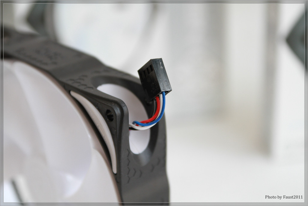 Bemerkenswert finde ich die Lösung für das Anschlusskabel. Am Lüfter ist nur eine 4-polige Buchse angebracht. Dazu gibt es zwei Anschlusskabel in den Längen 20 und 50 Zentimeter, die auch miteinander kombiniert werden können. Perfekt, um gerade bei kürzeren Distanzen nicht mit unnötig langen Kabeln hantieren und diese verstauen zu müssen.