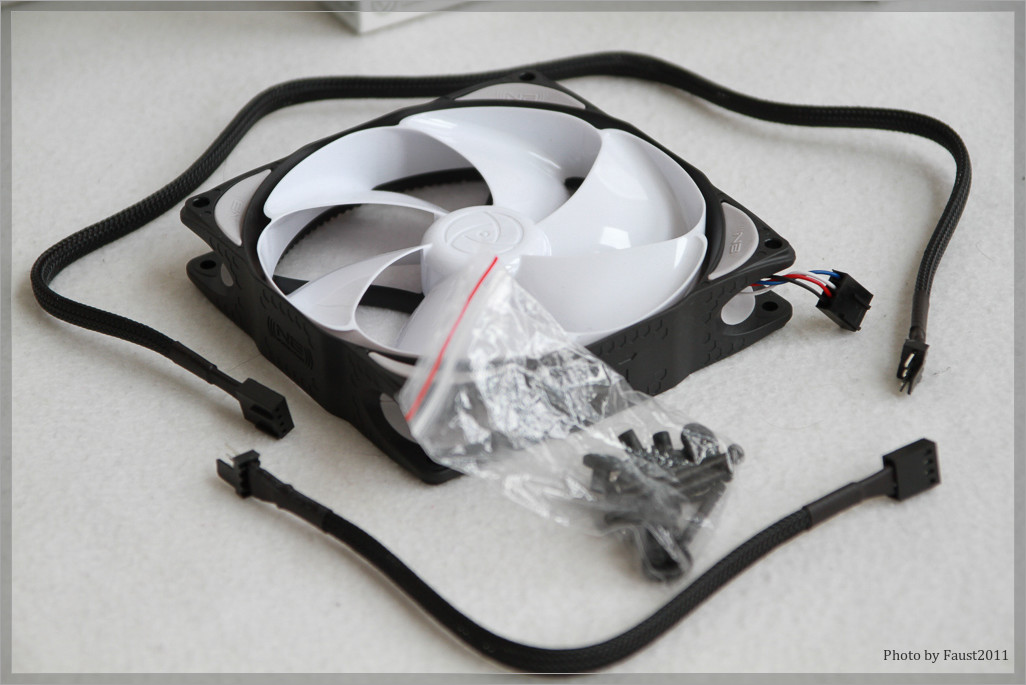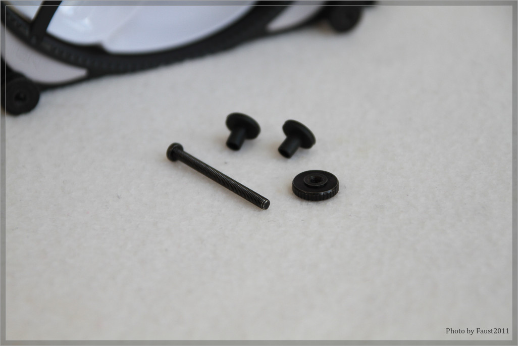 Der Lieferumfang des Lüfters erweist sich als reichhaltig und durchdacht. Neben dem eigentlichen Lüfter stecken in der Packung noch vier Schrauben zur Montage und passend dazu entsprechende Entkopplungshülsen aus Gummi sowie jeweils eine Rändelschraube zur Befestigung am Gehäuse bzw. an einem Radiator.