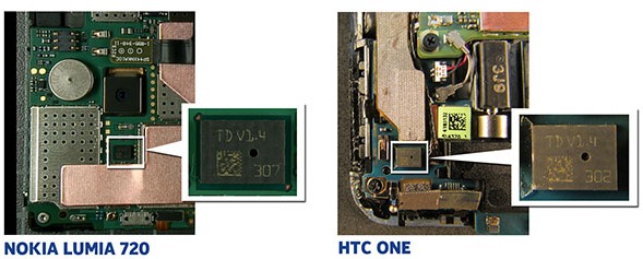 Was mich grad fast noch mehr schockiert, ist das folgende Bild. Wenn man mal den Aufbau des Nokia 720 mit dem HTC One vergleicht, dann sieht das HTC aus, als ob ich das von Hand verlötet und zusammengeschraubt hätte. Das Layout und das Durcheinander sind ja schrecklich und das beim Flagschiff