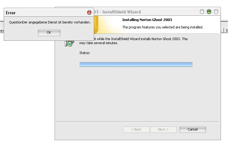 hi wenn ich norten ghost 2003 installieren will kommt am schluss questionder vorhanden und dann bricht er ab und deinstalliert alles wieder