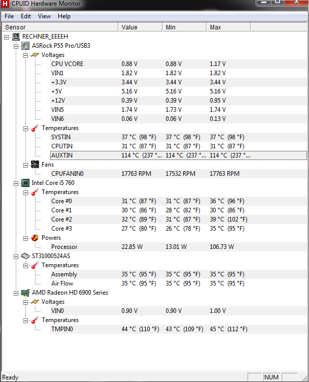 Heute habe ich dann mit den Programm Speedfan mal die Temperaturen ausgelesen und musste feststellen, dass die AUX Temp konstant bei 128°C steht (mit ner beruhigenden Flamme daneben)