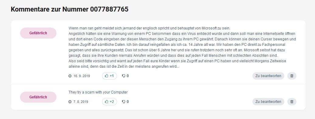 Das ist doch eine alte Masche die es seit Jahren schon gibt, das angebliche Microsoft Mitarbeiter anrufen und in Englich den Leuten einreden wollen das deren PC verseucht ist und die Leute den Betrügern mittels Software in Richtung TeamViewer Zugang zu ihrem PC geben sollen. Fallen die Leute darauf rein, wird ihr PC von den Betrügern infiziert. Hättest nur mal googeln müssen wegen sog. Fake Microsoft Mitarbeiter Anrufen: https://www.google.com/search?client=firefox-b-d&q=Fake+Microsoft+Mitarbeiter+rufen+anakimann schrieb:ich denke es war ein richtiger Hackversuch, bei mir hat gerade eine Frau dreimal mit verschiedenen Rufnummern angerufen und irgendwas auf Englisch geredet, daß ich ein Problem mit meinem Computer hätte, und ob ich davon schon wüsste. Als ich die Nummern gegoogelt habe https://www.wemgehoert.de/nummer/0077887765 , kam folgendes raus: