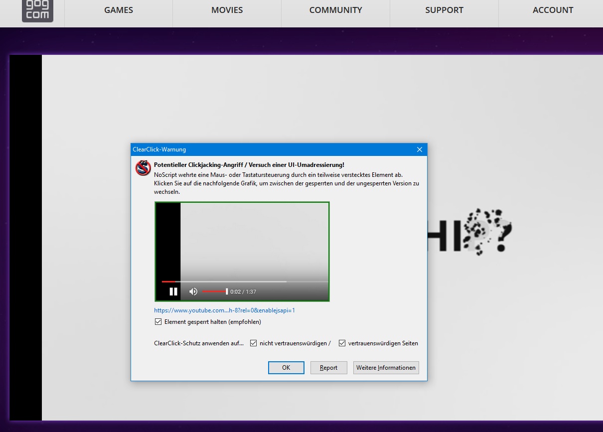 Hi, ich habe mir heute von der gog.com Seite den Client heruntergeladen. Um den Download zu starten, musste ich temporär etwas erlauben Neben dem Button zum download gibt es einen mit dem Titel das ist unsere Vision. Ich habe darauf geklickt und es öffnete sich ein video. Beim Versuch das zu pausieren. Meldete sich noscript mit der Meldung clickjacking ui-adressumleitung.