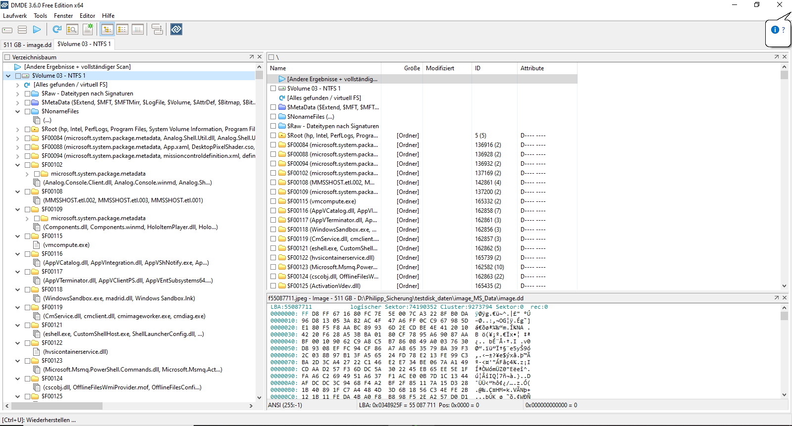 DMDE zeigt mir so einiges an, das sieht aber aus wie der Inhalt der Festplatte C: im Werkszustand, ohne Daten von mir.