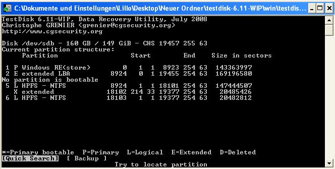 Wenn jetzt Partitionen gefunden wurden, kannst Du sie jeweils mit den Pfeiltasten anwählen und mit P deren Inhalt sichtbar machen. Mit Q geht es zurück ins Menü. Sollten keine Partitionen in der ersten Suche gefunden worden sein, wird mit Enter weiter gemacht, hier ist dann im Menü [ Quit ] [ Deeper Search ] [ Write ], die tiefere Suche mit Deeper SEARCH auszuwählen (dieser Vorgang kann dann schon eine Weile dauern).