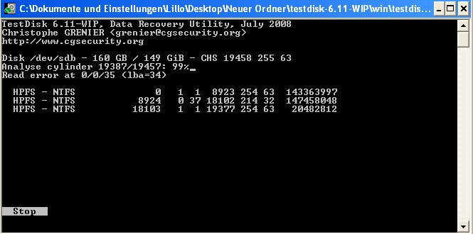 Wenn Testdisk zu lange sucht (mehr als einige Minuten, teile es mit.