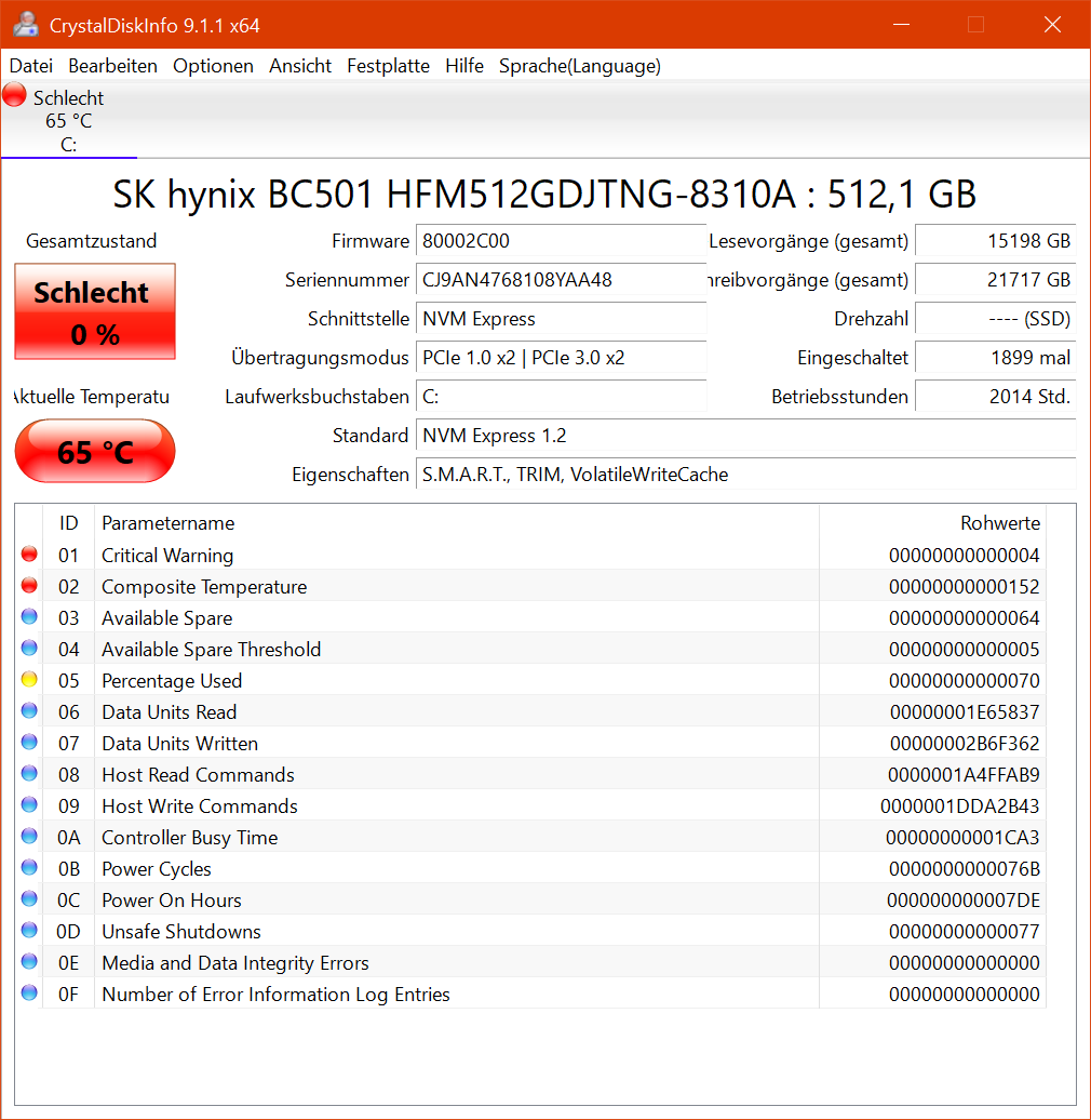 Crystal Disk Info gibt jedoch eine Warnung und schlechte SMART Werte (Screenshot im Anhang) aus (Das Notebook ist seit drei Jahren in Benutzung).