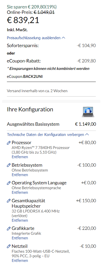 Der weiter vorne genannte Weg zum Rabatt ist tatsächlich etwas verwirrend. Ich hatte im firefox zusätzlich ein privates Fenster geöffnet und das Notebook in beiden Fenstern konfiguriert. Am Ende erschien der Rabatt "Wenn Sie das Notebook jetzt in den Warenkorb legen erhalten sie 15% Nachlass." im gewöhnlichen Fenster, ohne das ich die Chronik etc. gelöscht habe.