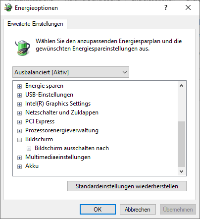 Im Internet findet man den Hinweis, dass man die Option in den Energieeinstellungen unter Bildschirm de-/aktivieren kann. Diese Option gibt es bei mir gar nicht: