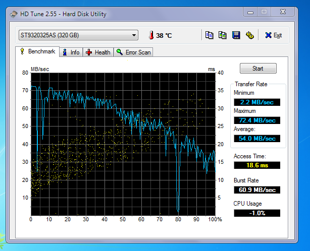 Außerdem passiert es 1-3 mal im Monat, dass die Festplatte etwa 10 Sekunden lang laut klackert. Dabei hängt das ganze System. Hab mal HD Tune laufen lassen, siehe Anhang.