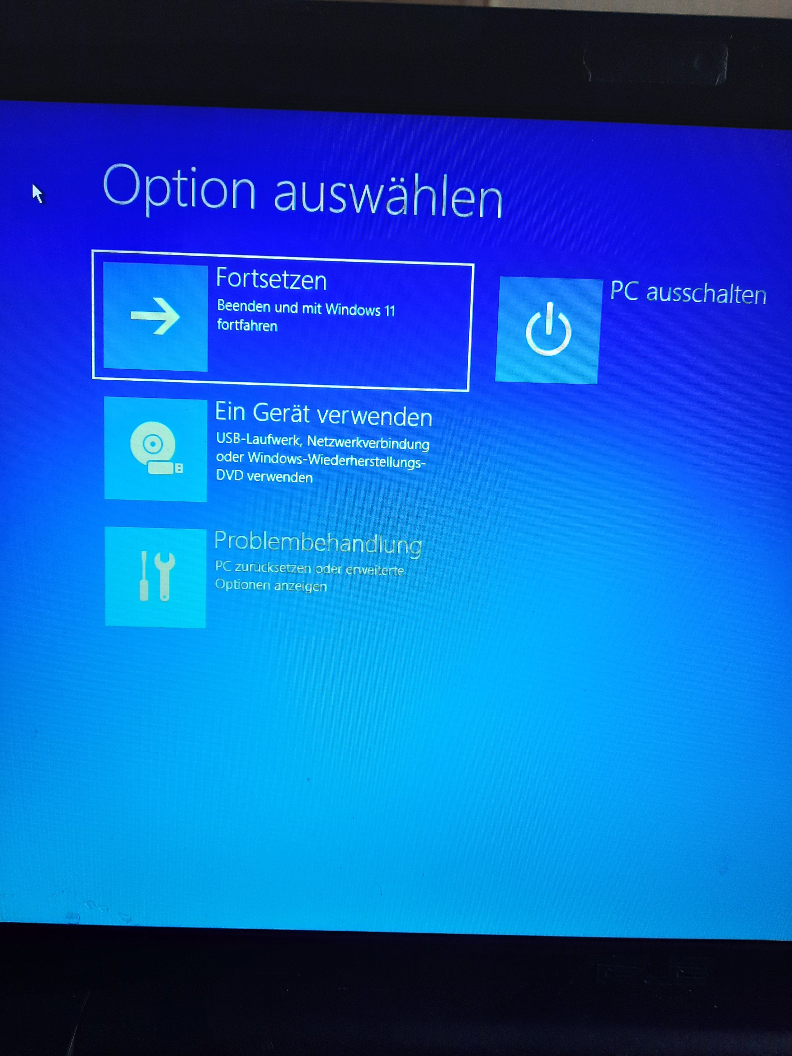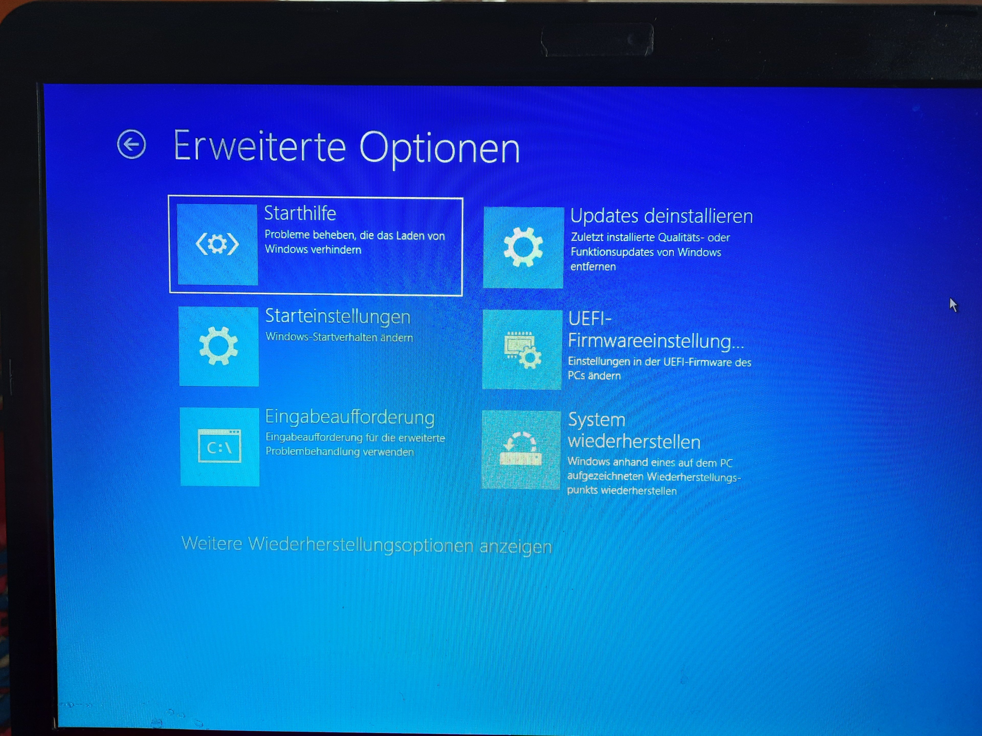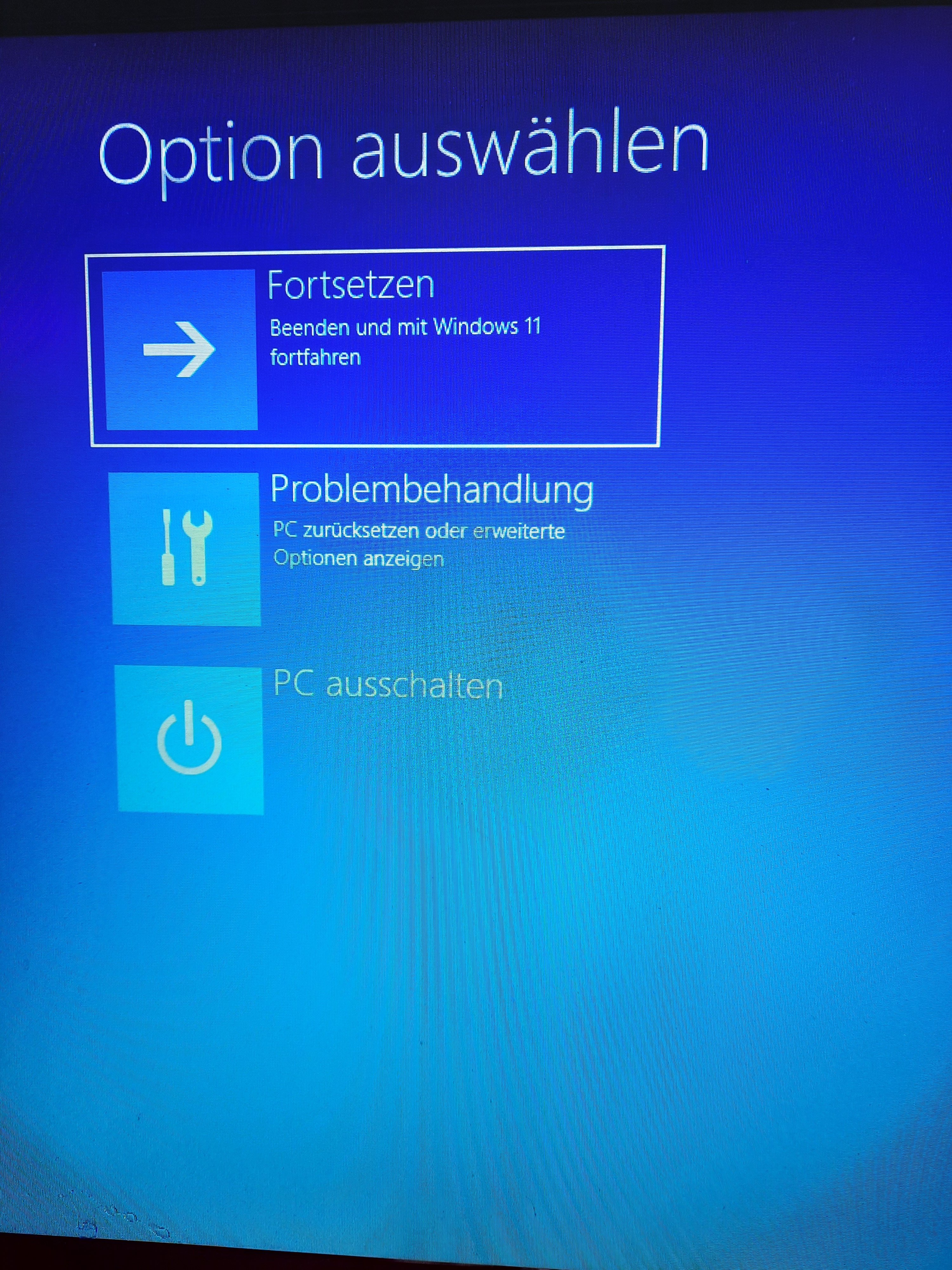 Der Laptop hat ein Update durchgeführt. Er startet und dann kommt die Anzeige, siehe Foto. Klicke ich oben, fährt er runter und startet neu bis wieder diese Anzeige kommt. Klicke ich rechts fährt er runter. Klicke ich auf das untere Feld, kommen die folgenden Bilder. Während dem Neustart kommt, automatische Fehlerbehebung wird durchgeführt. Problembehandlung habe ich auch gemacht ist 2,5 h gelaufen. Dann kam eine BIOS Anzeige und ich habe auf enter/exit geklickt. Dann kam wieder das Bild Option auswählen.