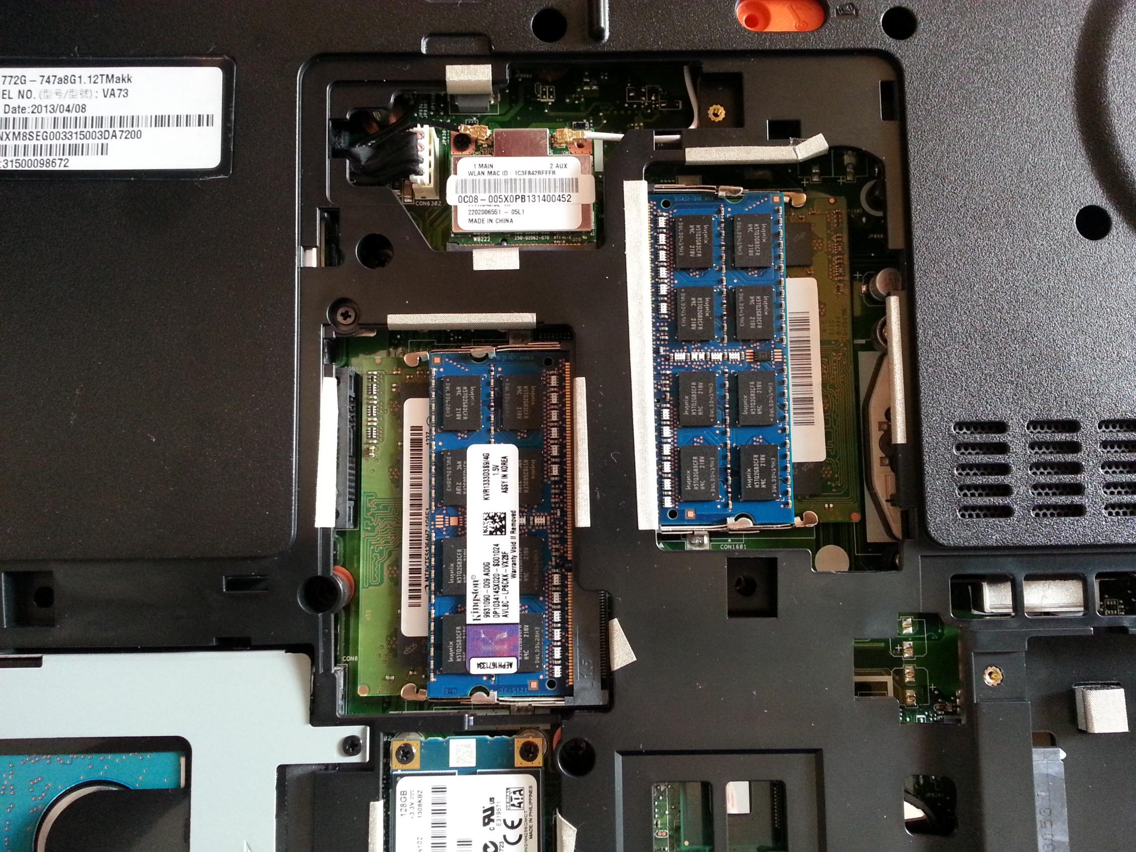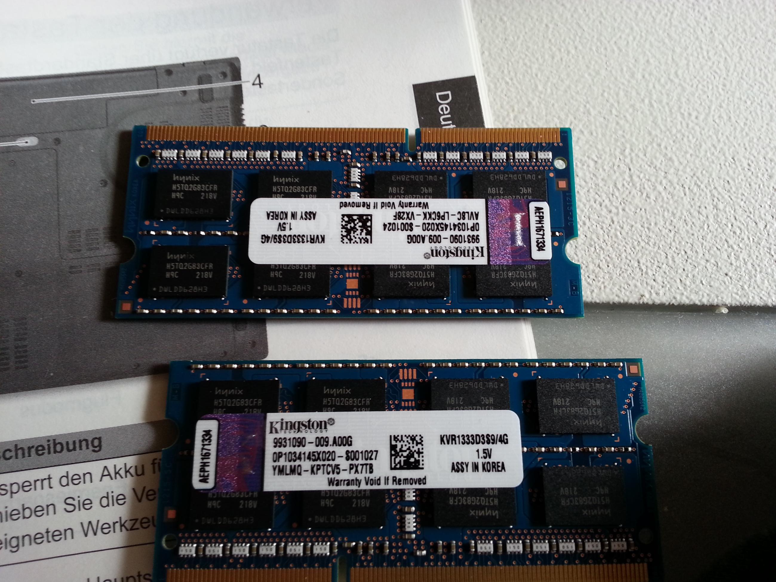 Hier nochmal Bilder von Laptop mit Ram komplett, ohne nachgerüsteten und den nachgerüsteten separat/ausgebaut.