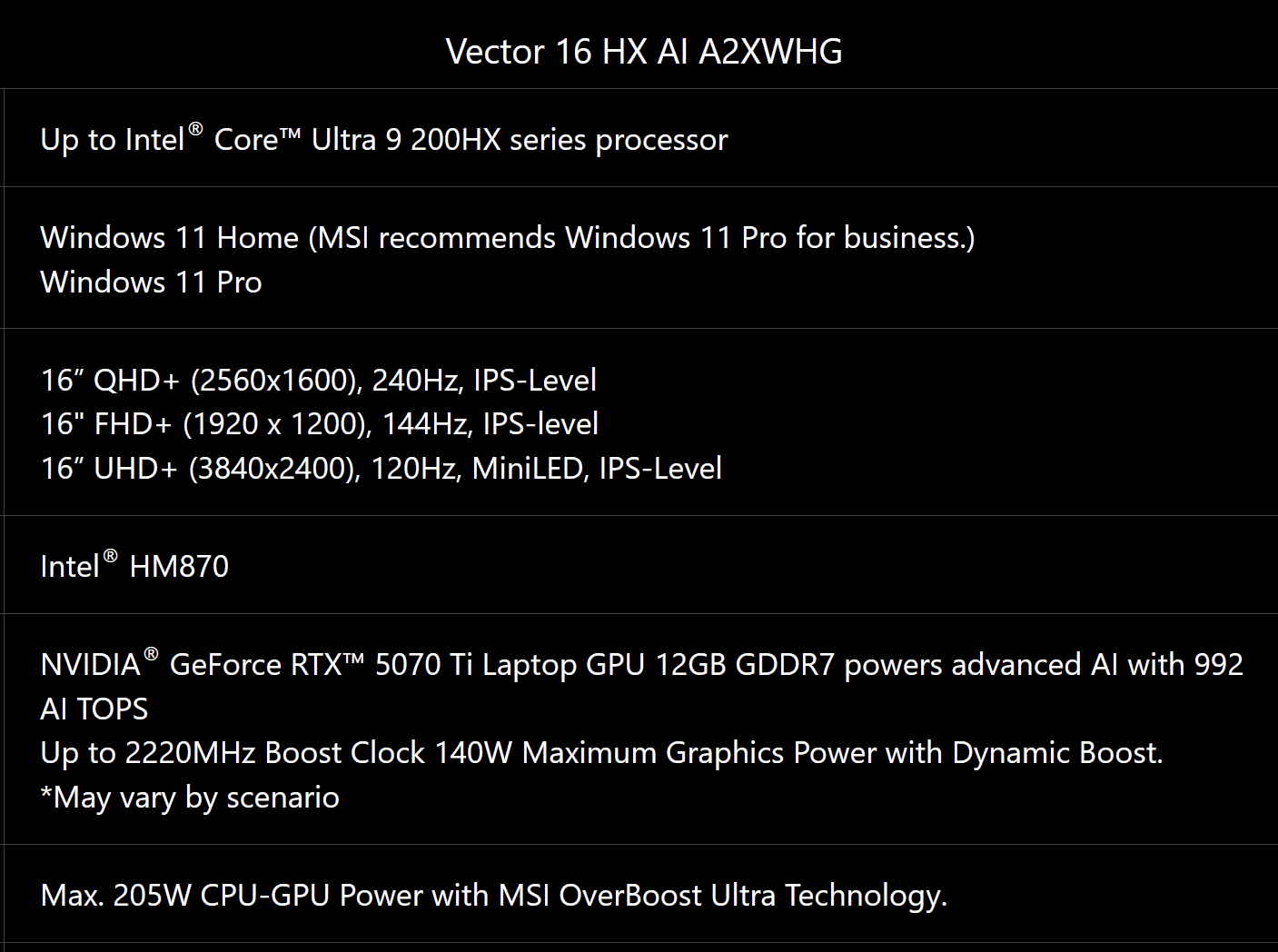 Immer auf das Netzteil achten... nur mal so als Tip. Das Vector 16 HX kommt mit 330W daher. Das Vector A18 HX sogar mit 400W und einem max. TDP Wert von 225W mit AMD Ryzen 9 9955HX und RTX5070Ti.