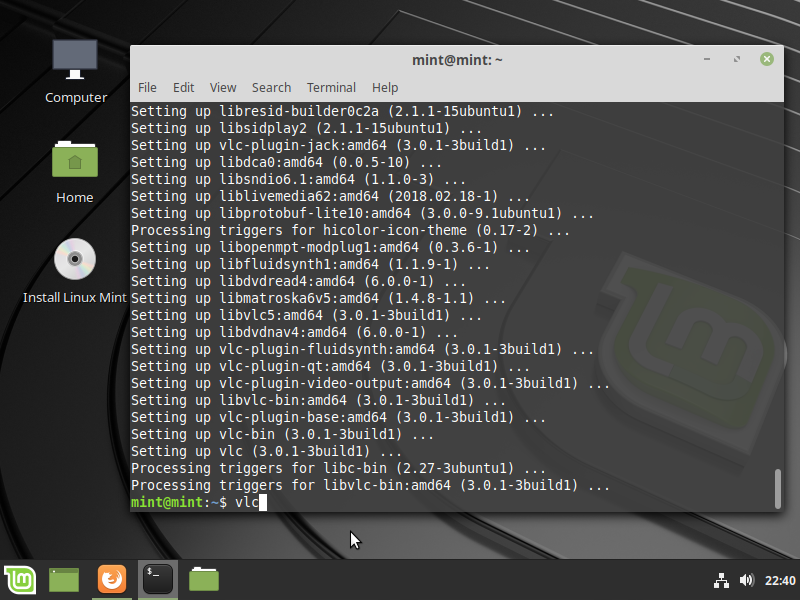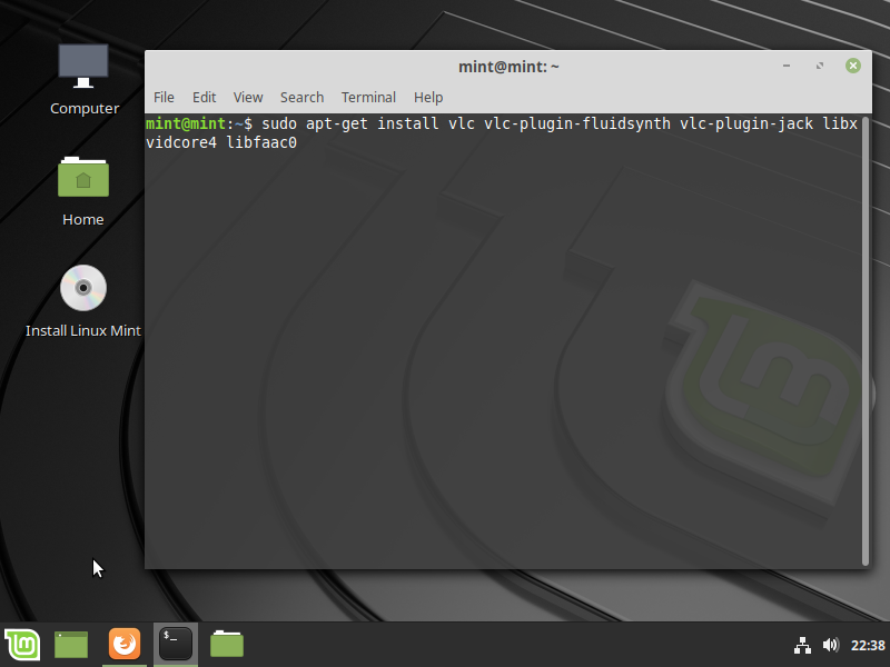 sudo apt-get install vlc vlc-plugin-fluidsynth vlc-plugin-jack libxvidcore4 libfaac0