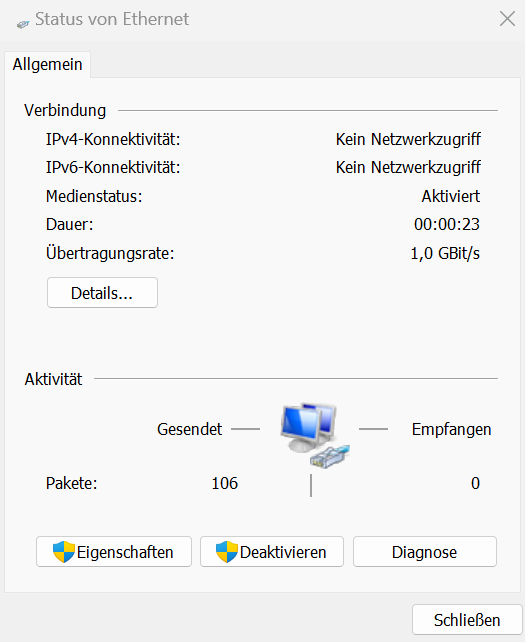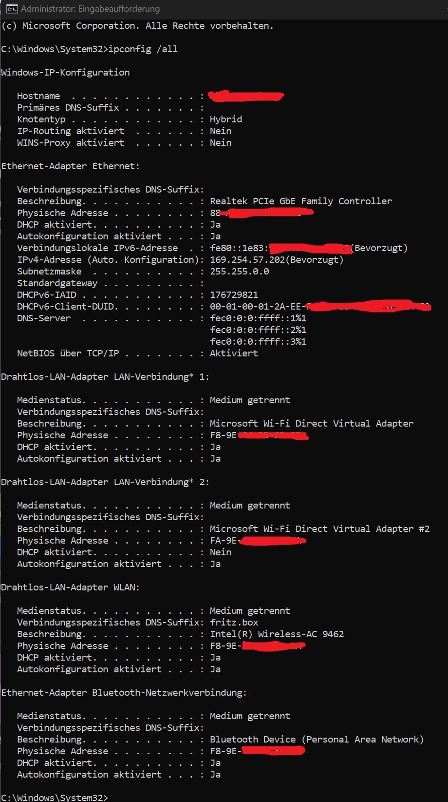 lass mal das Netzwerk zurücksetzen durch Windows, denn der NUC scheint sich keine IP via DHCP zu ziehen