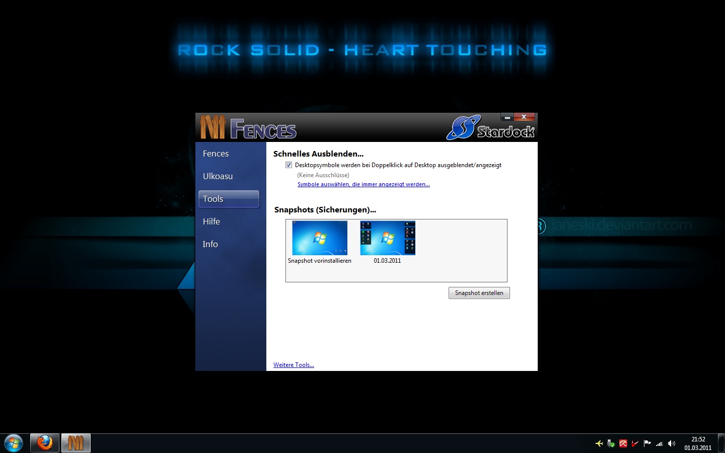 Auf den ersten beiden Bildern sehr Ihr meinen Desktop. Mit nur einem doppelklick auf den freien Desktop verschwinden alle Symbole. Und mit einem Doppelklick sind sie wieder da.
