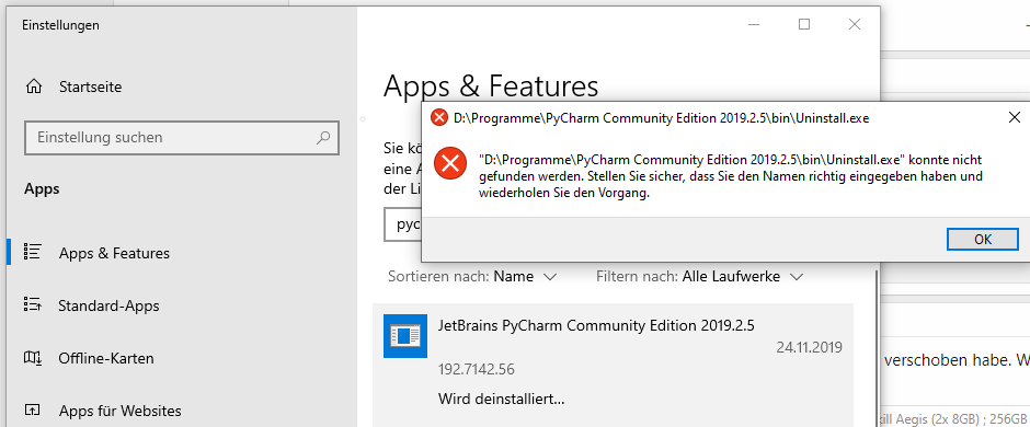 Woran liegt das? Gibt es einfachere Wege Numpy zu installieren? Vor allem habe ich Numpy bereits benutzt, der Fehler tritt erst auf, seitdem ich PyCharm und Python auf eine andere Festplatte geschoben habe; jetzt sagt PyCharm bzw. der Python-Interpreter "ModuleNotFoundError: No module named 'numpy'"...