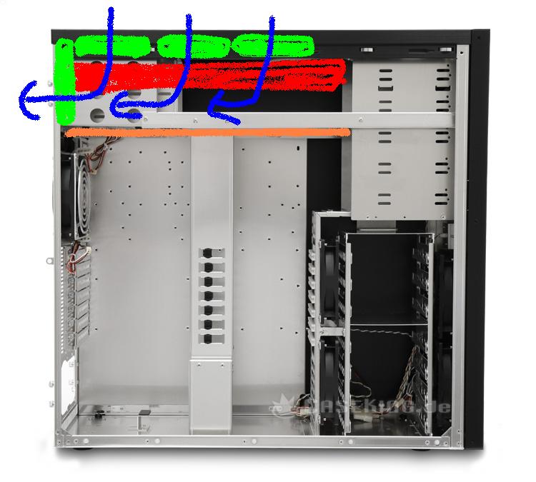 Ich würde gern die Lüfter über den Radiator setzen und in durch ihn in das Gehäuse blasen lassen. Da in diesem Fall die Temp im Gehäuse steigt, habe ich vor im oberen Bereich des Gehäuses eine Alu Platte einzuziehen und damit den Ratiator komplett abzuschotten. Der 120 im oberen Bereich hinten bekäme von einem weiteren 120er im vorderen Bereich Unterstüzung, so das die Abwärme nicht ins Case, also an die Hardware gelangt, sondern direkt abgeführt wird.