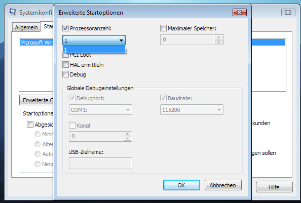 Wollte heute mal sehen, wie hoch die Bootgeschwindigkeit von 1 Kern und 2 Kernen ist. Hab dann mal wieder bei Ausführen->msconfig->Start->Erweiterte Optionen->Prozessor Anzahl auf 1 gestellt und die Zeit gestoppt. ok waren beachtliche 1:05. Dann auf 2 Kerne gestellt und aufeinmal steht da beim booten irgendwas in Rot vonwegen overclocking fehlgeschlagen