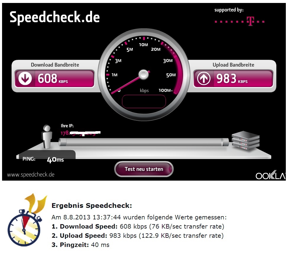 YouTube, Downloads, Webseitenaufrufe dauern teilweise ewig. Ping und Upload sind jedoch im grünen Bereich. Was mir aufgefallen ist: Werden von diversen Applikationen Mehrfachverbindungen genutzt wie es scheinbar speed.io tut oder auch Steam oder Origin funktioniert es nahezu mit Full Speed, das heißt ich bekomme dann 13Mbit. Mach ich aber normale Downloads, YouTube oder andere Speedtests wie speedtest.net dann hab ich durchgängig 1Mbit oder sogar darunter. Es ist auch egal mit welchem Gerät ob Tablet oder PC, überall die selbe Sch****. Die ganze Geschichte dauert dann meistens immer 1 Woche und dann hab ich überall wieder Fullspeed und nach meist 2 Wochen gehts wieder von vorne los.