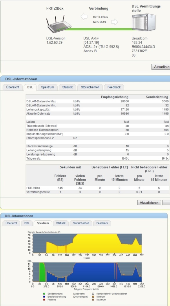 Hab mir jetzt gerade Spaßeshalber die Arbeit gemacht und die Box für 5 Min vom Strom genommen. Fazit: Sie synchronisiert mit 2Mbit weniger, dafür etwas höhere Störabstandsmarge (6dB) aber das wichtigste: Läuft alles genau so besch***** wie vorher
