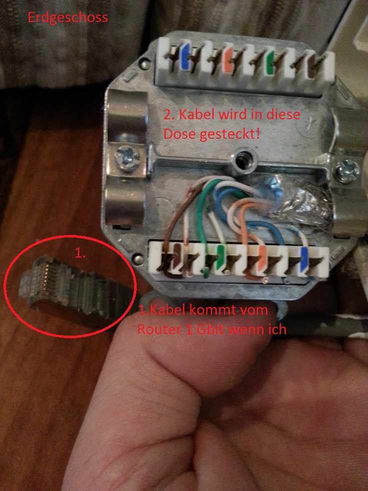 Im oberen Stockwerk habe ich dann nochmal so eine Dose. Wenn ich hier das Laptop mit einem weiterem Netzwerkkabel anstecke, habe ich nur 100mbit.