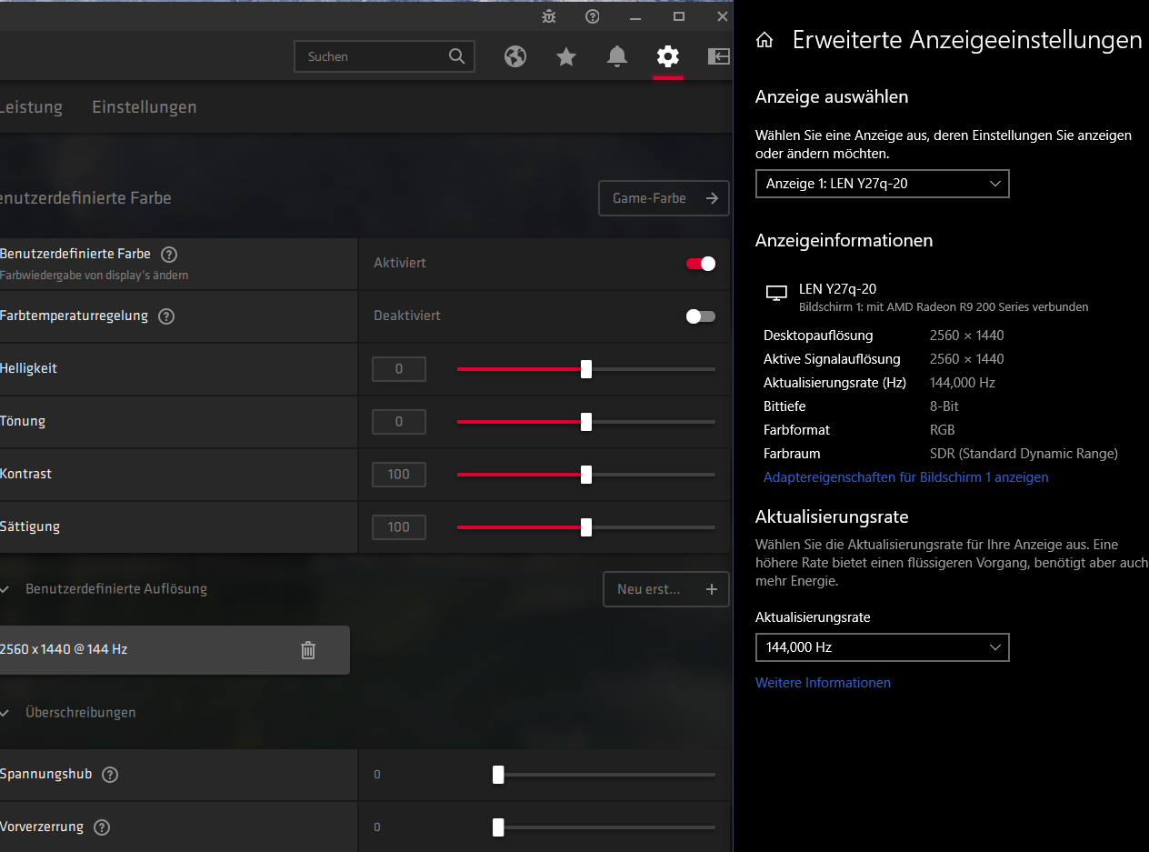 Mein eingesetzter Monitor steht oben. Unter Aktualisierungsrate kann ich nur 60, 75, 100 und 120Hz auswählen.
