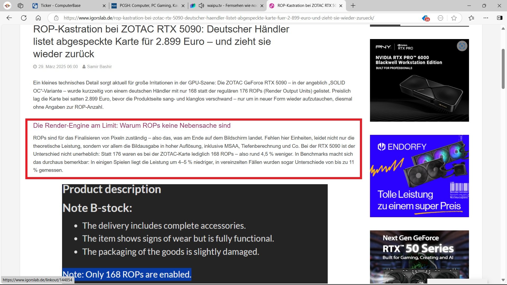 Das Problem ist einfach, dass man eine Grafikkarte verkauft, wo RoPs fehlen, ja alles klar ersichtlich, ja so ist Marktwirtschaft, Alternate versucht natürlich daraus Kapital zu schöpfen. Wie wäre es aber die defekten Karten als händler direkt an Nvidia wieder zurückschicken? Aber Nvidia würde sich da sowieso wieder aus der Verpflichtung nehmen. Andere Variante wäre Alternate nimmt Kontakt mit ZOTAC oder anderen Herstellern auf und wickelt das mit denen ab. Aber ja, ich weiss zu teuer. Zu aufwendig. Alternate würde Verluste damit einfahren, also verkauft man teils defekte Ware einfach als B Ware weiter. Ich warte nur darauf bis sich das überall so durchsetzt. Mal gucken, ob das dann immer noch befürwortet wird und als ist nicht so schlimm abgetan wird. Einer macht den Anfang. Andere ziehen nach. So war das schon immer.Xes schrieb:Solange für die potentiellen Käufer klar ersichtlich ist, dass ROPs fehlen können die Teile doch problemlos verkauft werden. Das ist weit besser, als wenn Nvidia die verschrottet.