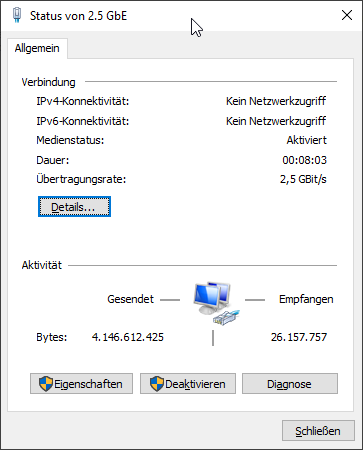 - Einstellung "Speed & Duplex" auf "2.5 Gbps Full Duplex" in den Treibereinstellung der Realtek-Karte eingestellt