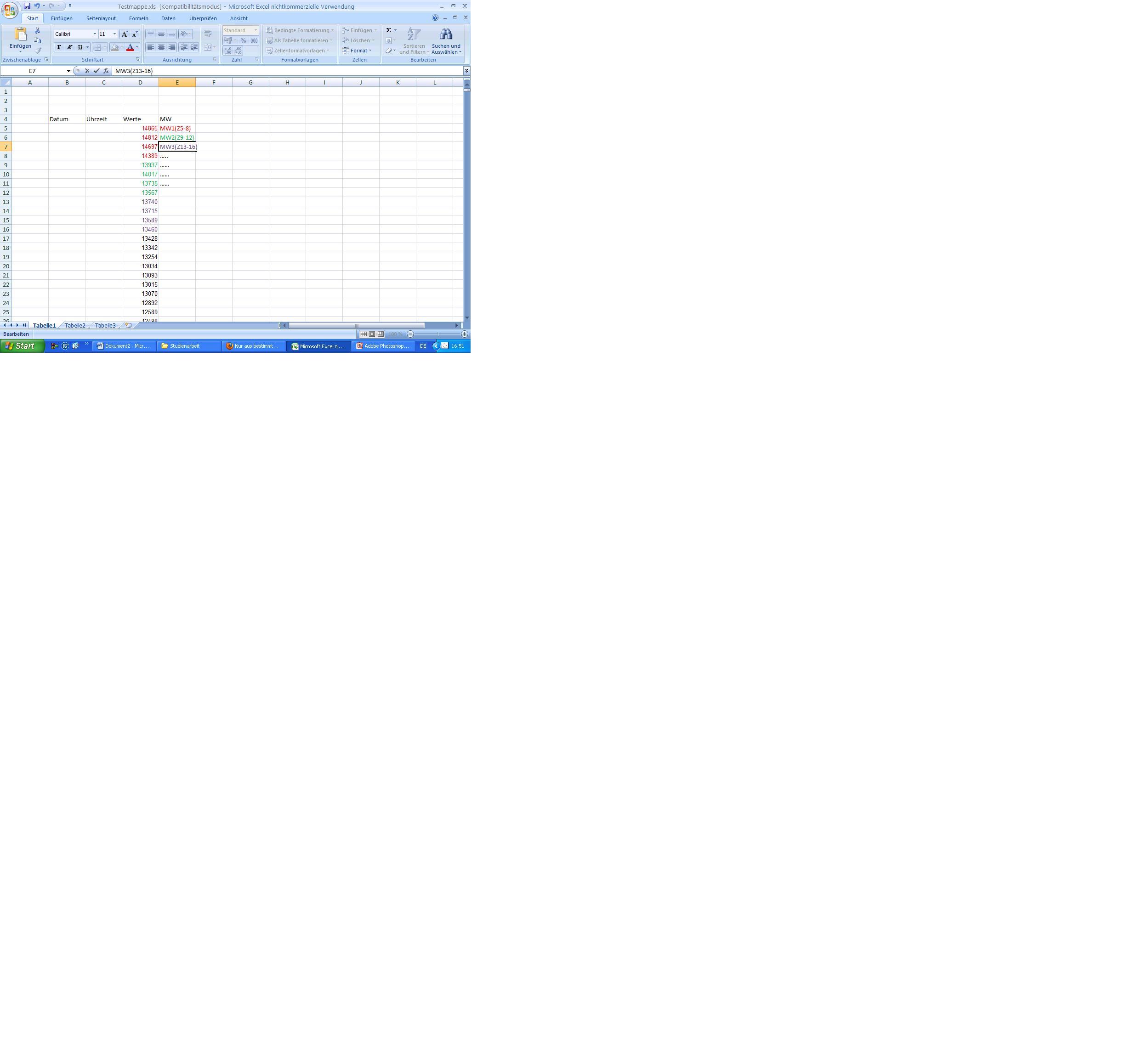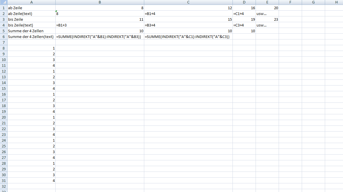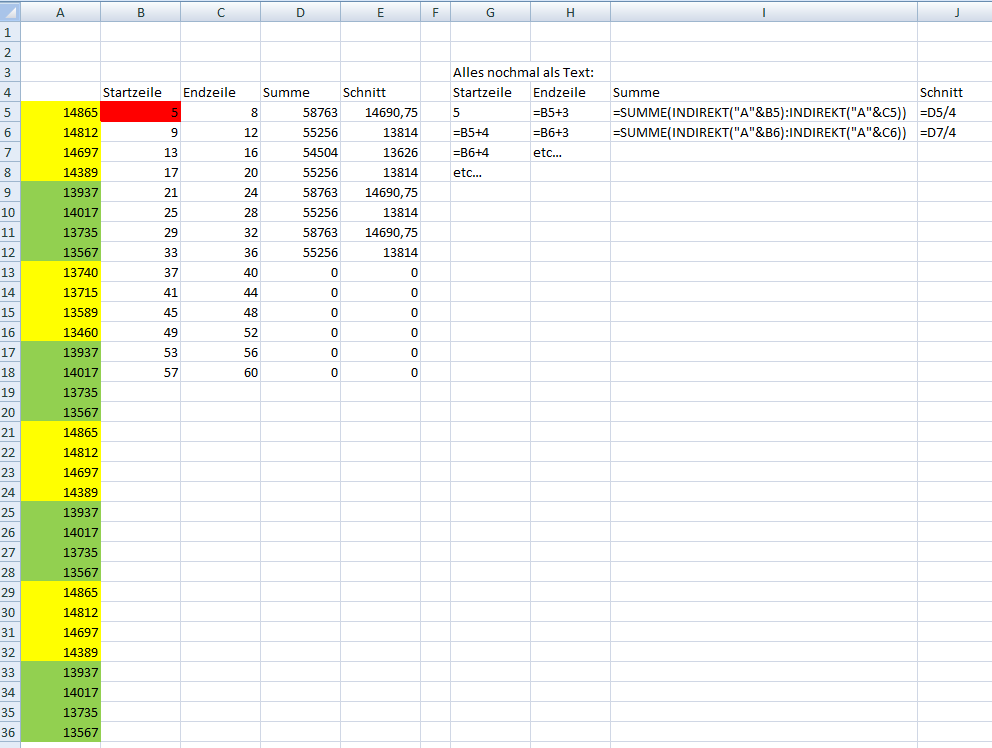 Ich möchte aus einer Spalte,von oben nach unten immer von 4 Zahlen den Mittelwert bilden und in eine neue Spalte schreiben.Also z.B. in Spalte B Zeile 1-4 ist ein M-WErt-->in spalte C Zeile1,Spalte B 5-8 ist ein M-W-->in Spalte C Zeile 2 usw....