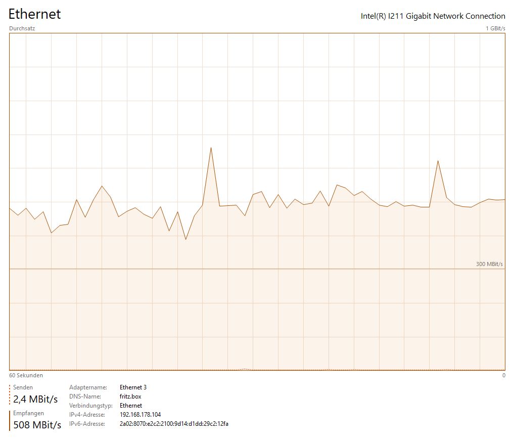 P.S.: Im Anhang ein Screenshot meiner Netzwerkkarten-Auslastung beim kopieren einer 6 GB großen Film-Datei vom Pi.