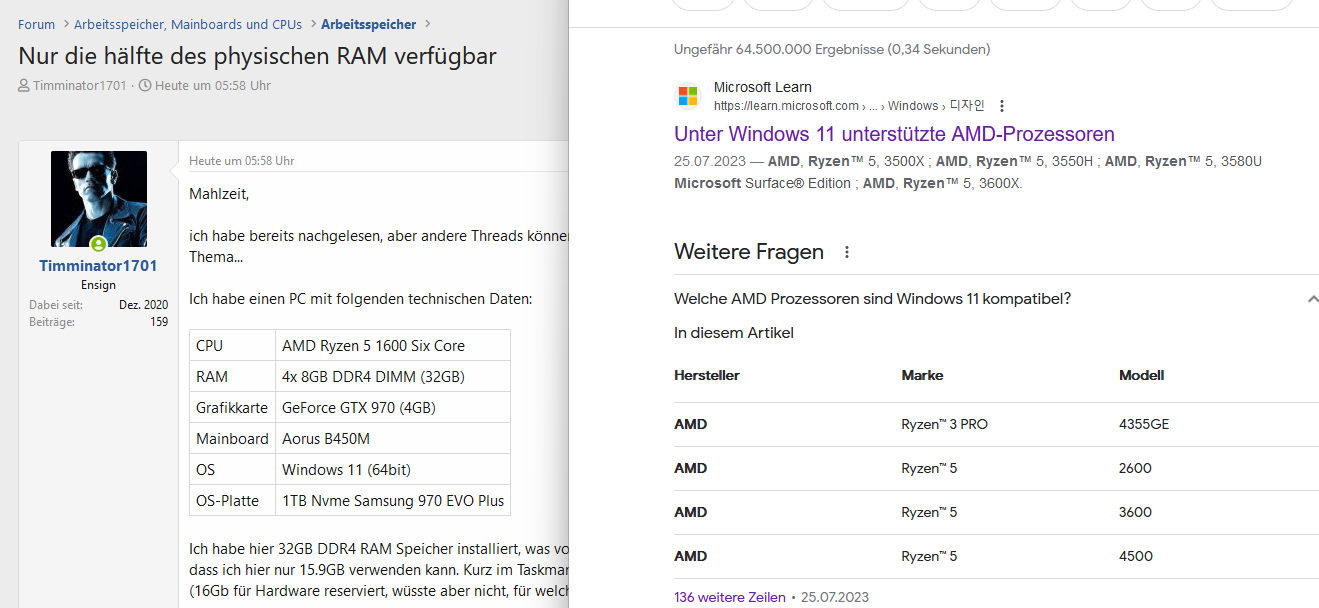 Ich habe hier 32GB DDR4 RAM Speicher installiert, was von Windows auch erkannt wird. Leider wird mir angezeigt, dass ich hier nur 15.9GB verwenden kann. Kurz im Taskmanager nachgesehen, sind tatsächlich nur 15.9GB verwendbar (16Gb für Hardware reserviert, wüsste aber nicht, für welche, da Grafik dediziert ist).
