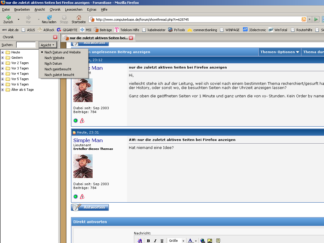 vielleicht stehe ich auf der Leitung, weil ich soviel nach einem bestimmten Thema recherchiert/gesurft habe, ABER wie kann ich mir bei Firefox unter der History, oder sonst wo, die besuchten Seiten nach der Uhrzeit anzeigen lassen?