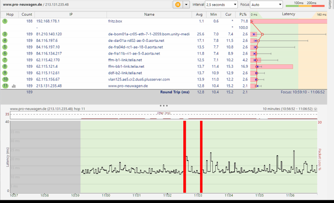 Ich habe auch mit tracert den Verbindungsweg überprüft und verglichen. Kann aber keine Unterschiede feststellen.