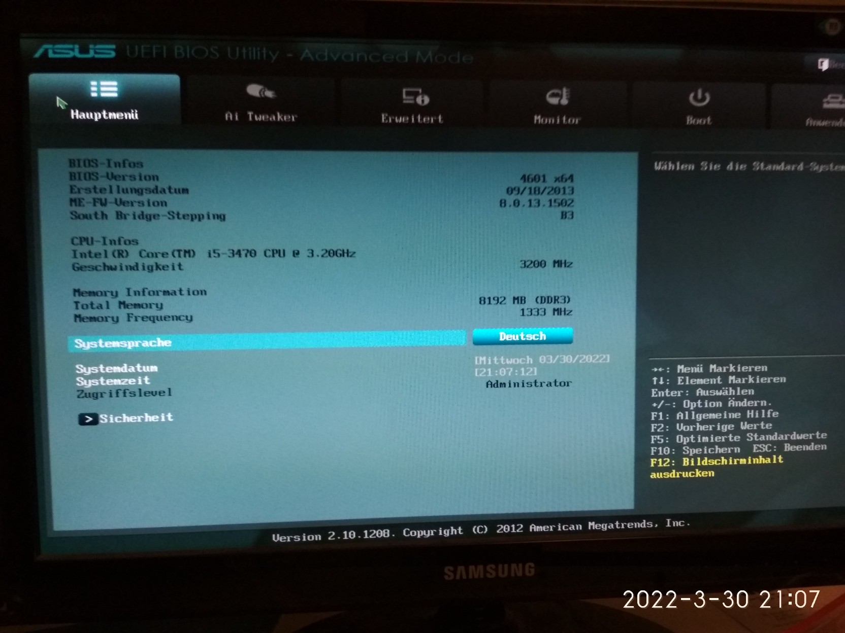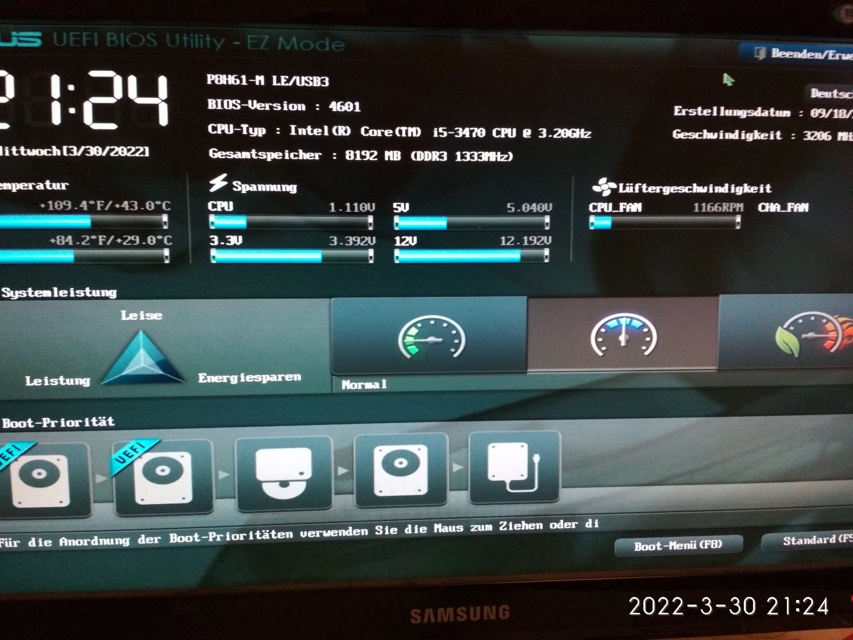 Mein Mainboard ist ein asus p8h61-m le/usb3 mit 2 DIMM Slots. BIOS V4601. Scheint die neueste Version zu sein.