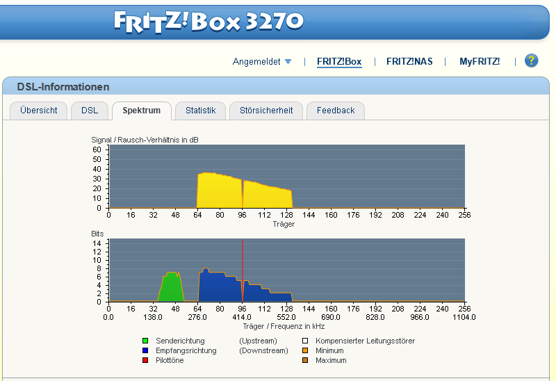 Seit einigen Tagen bekomme ich an meiner Fritzbox 3270 an einem 2000er DSL-Anschluss nur noch ca. 1000 kBit/s (früher hatte ich damit die vollen 2000 kBit/s) und eine relativ hohe Kabeldämpfung an: 56 dB (früher waren es 35-38dB).