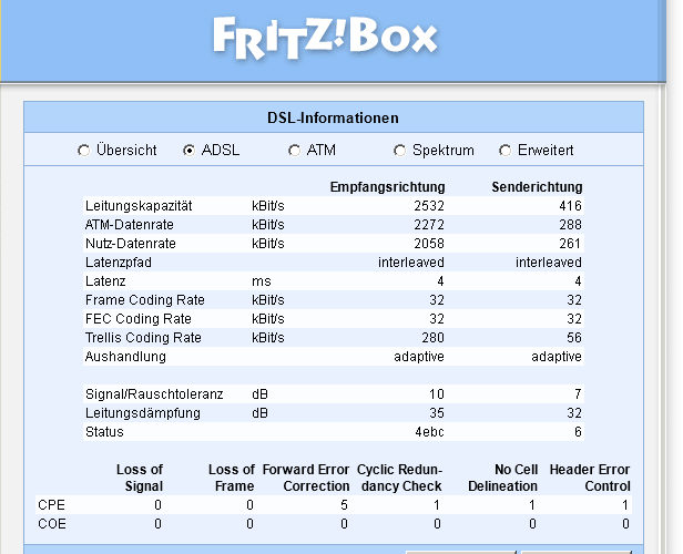 Habe dann meine alte Fritzbox SL angeschlossen: volle ca. 2000kBit/s, Kabeldämpfung 35 dB, also alles OK!